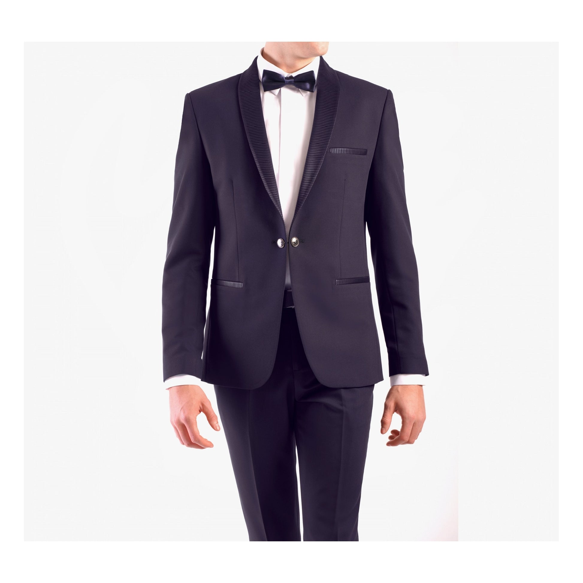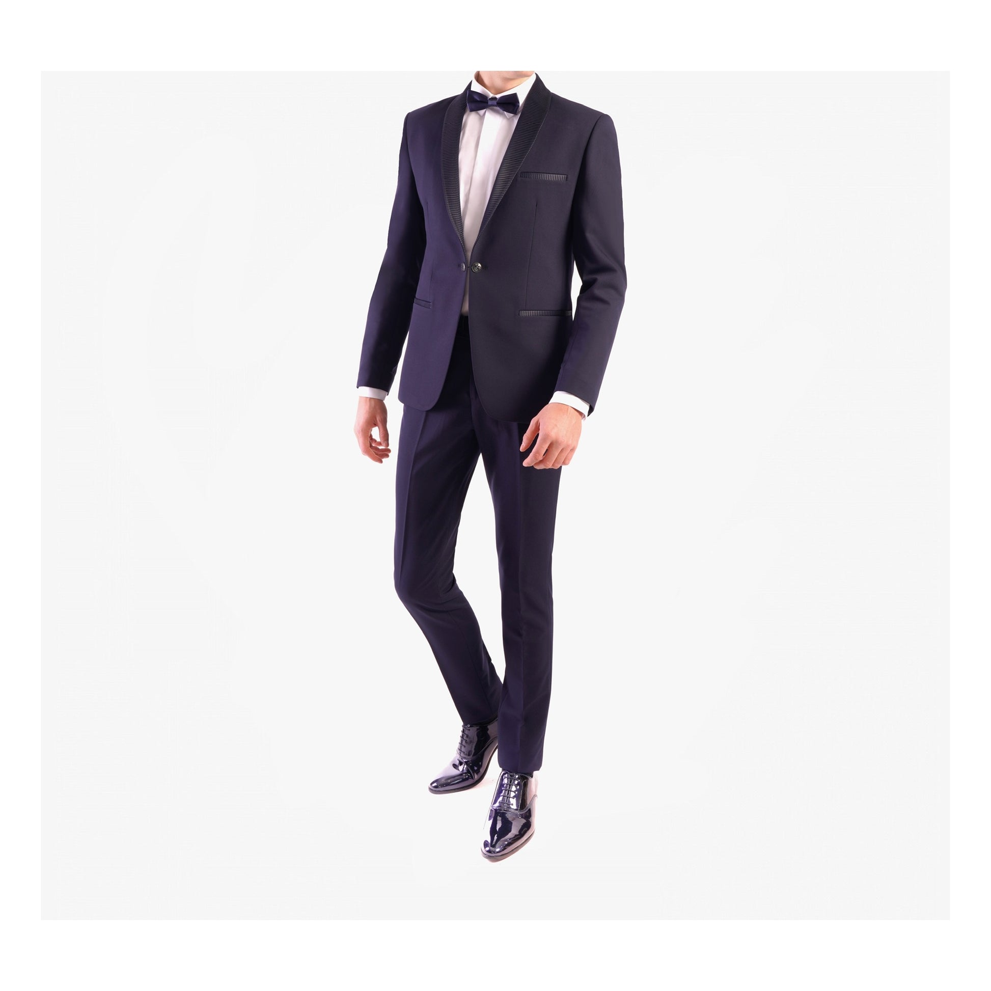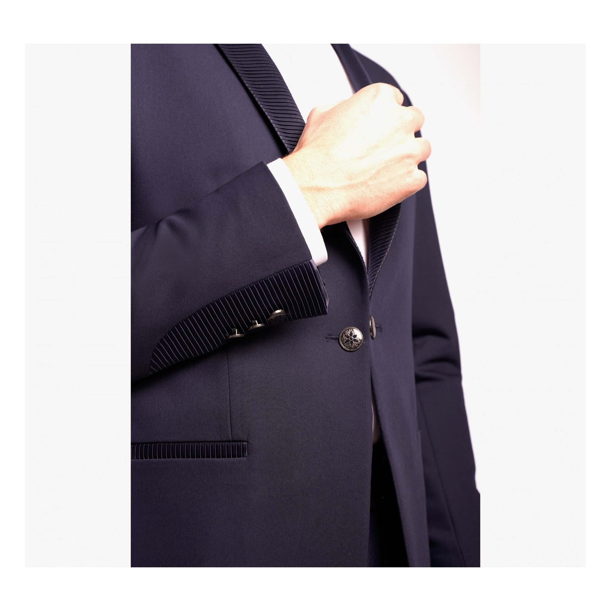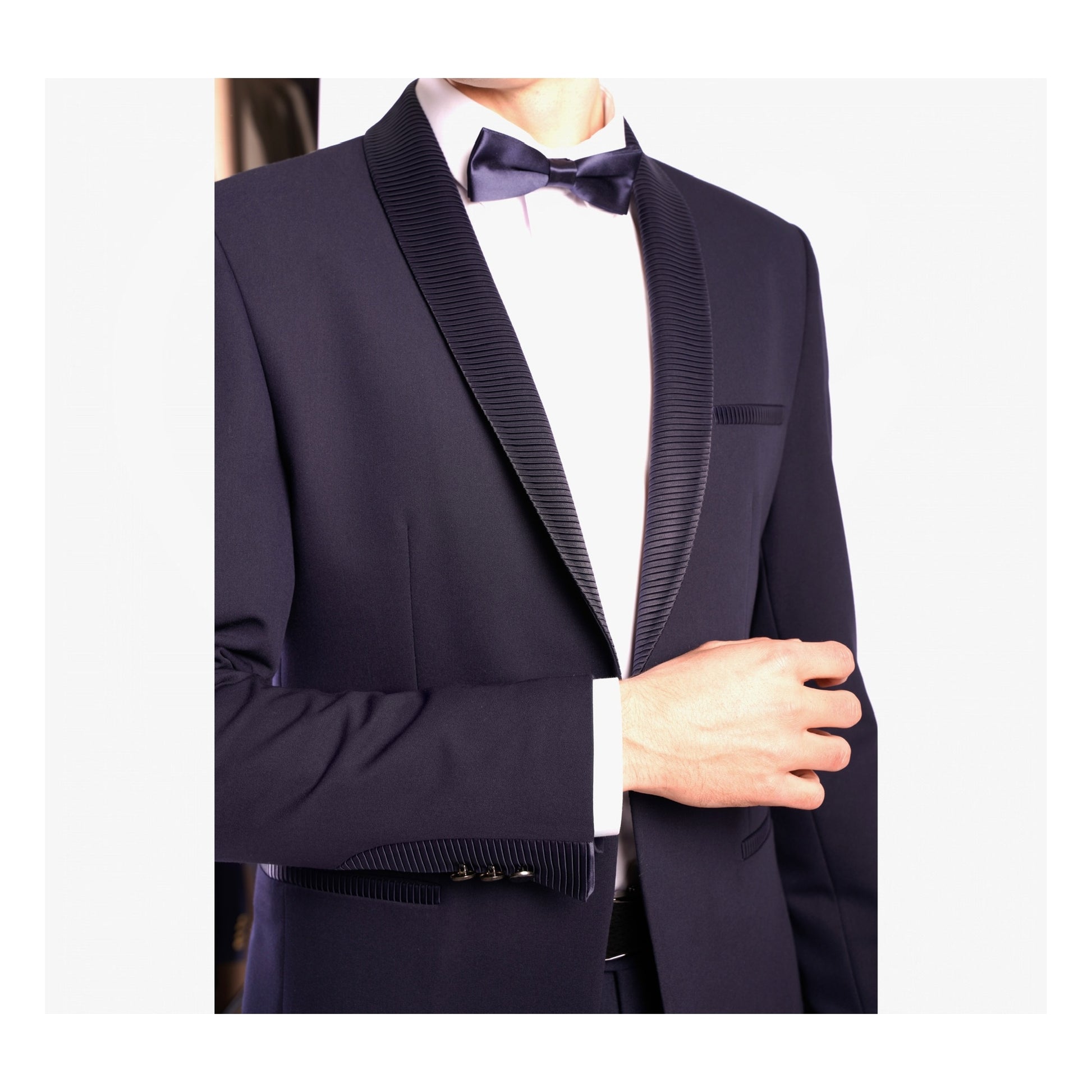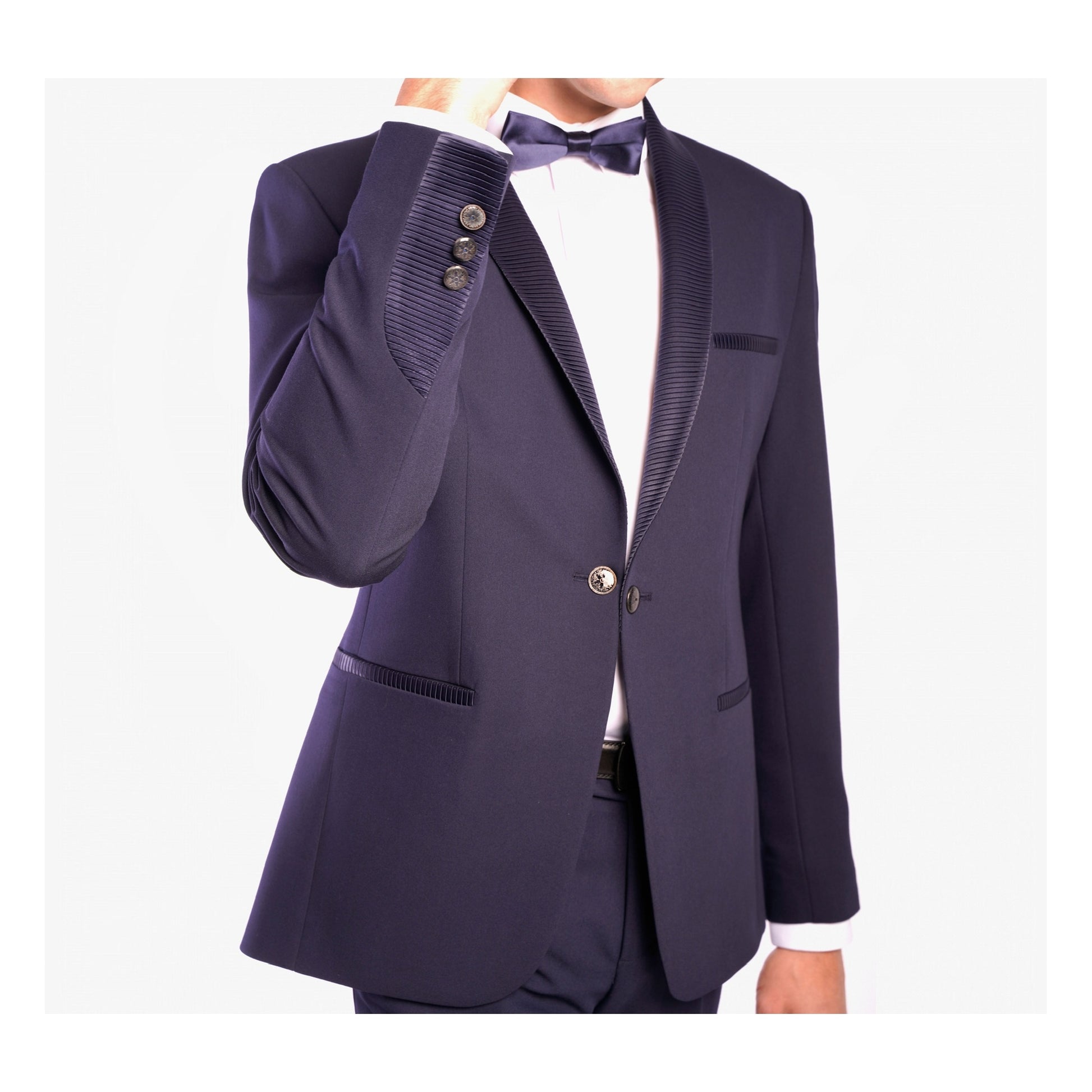 Dieser Smoking aus Wollmischung verfügt über Lycra für optimalen Komfort. Dieses körperbetonte Set besteht aus einer plissierten Satinjacke mit Schalkragen und zwei Pattentaschen und einer Hose mit Reißverschluss und zwei italienischen Taschen.