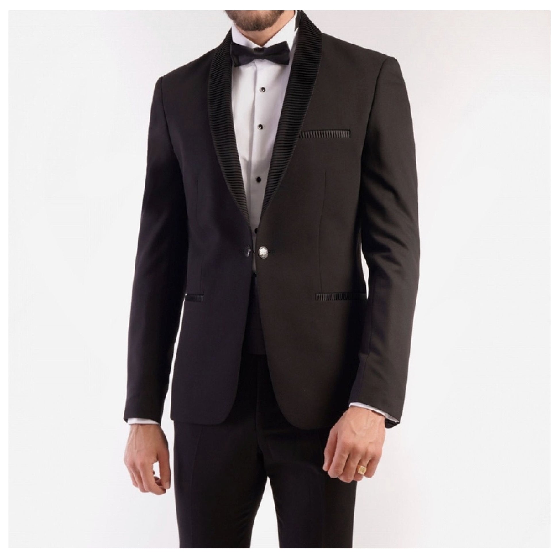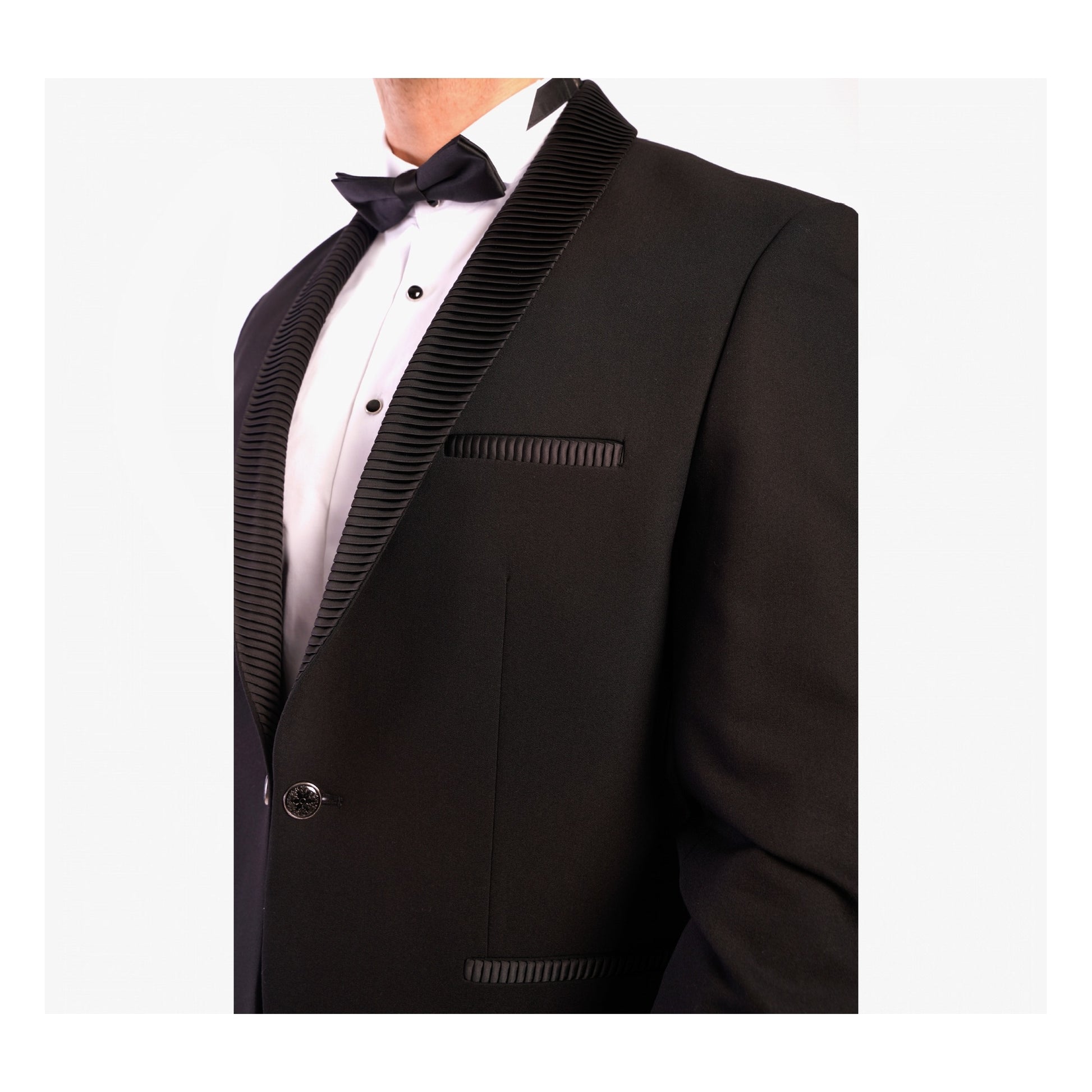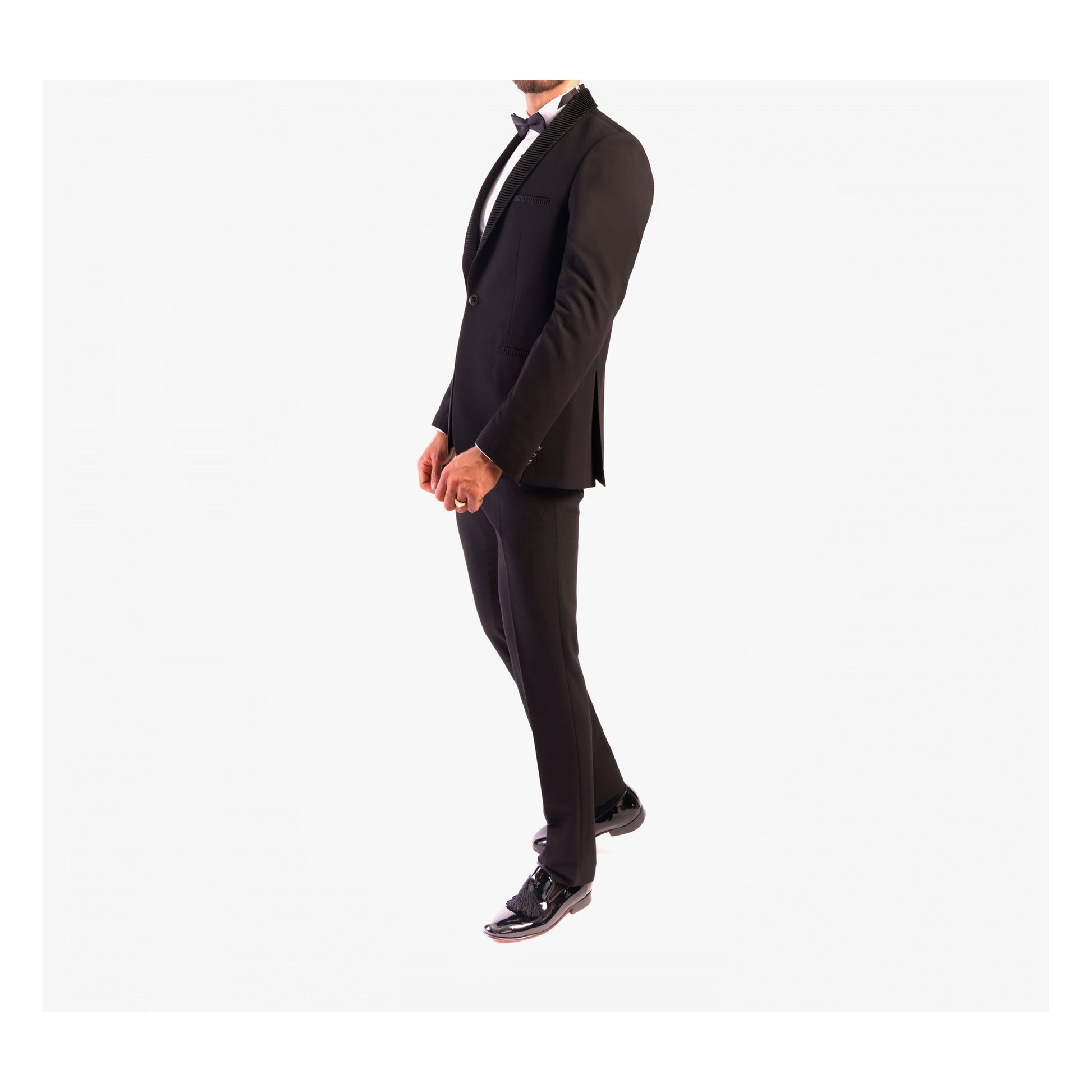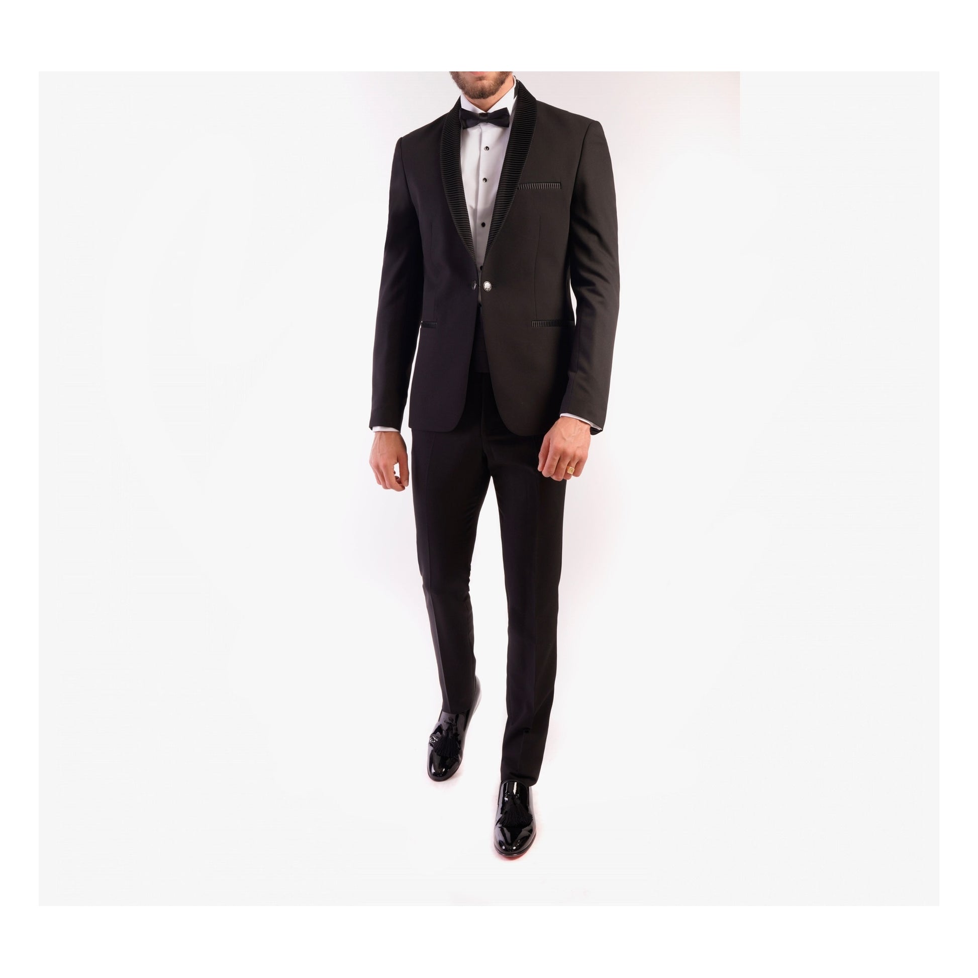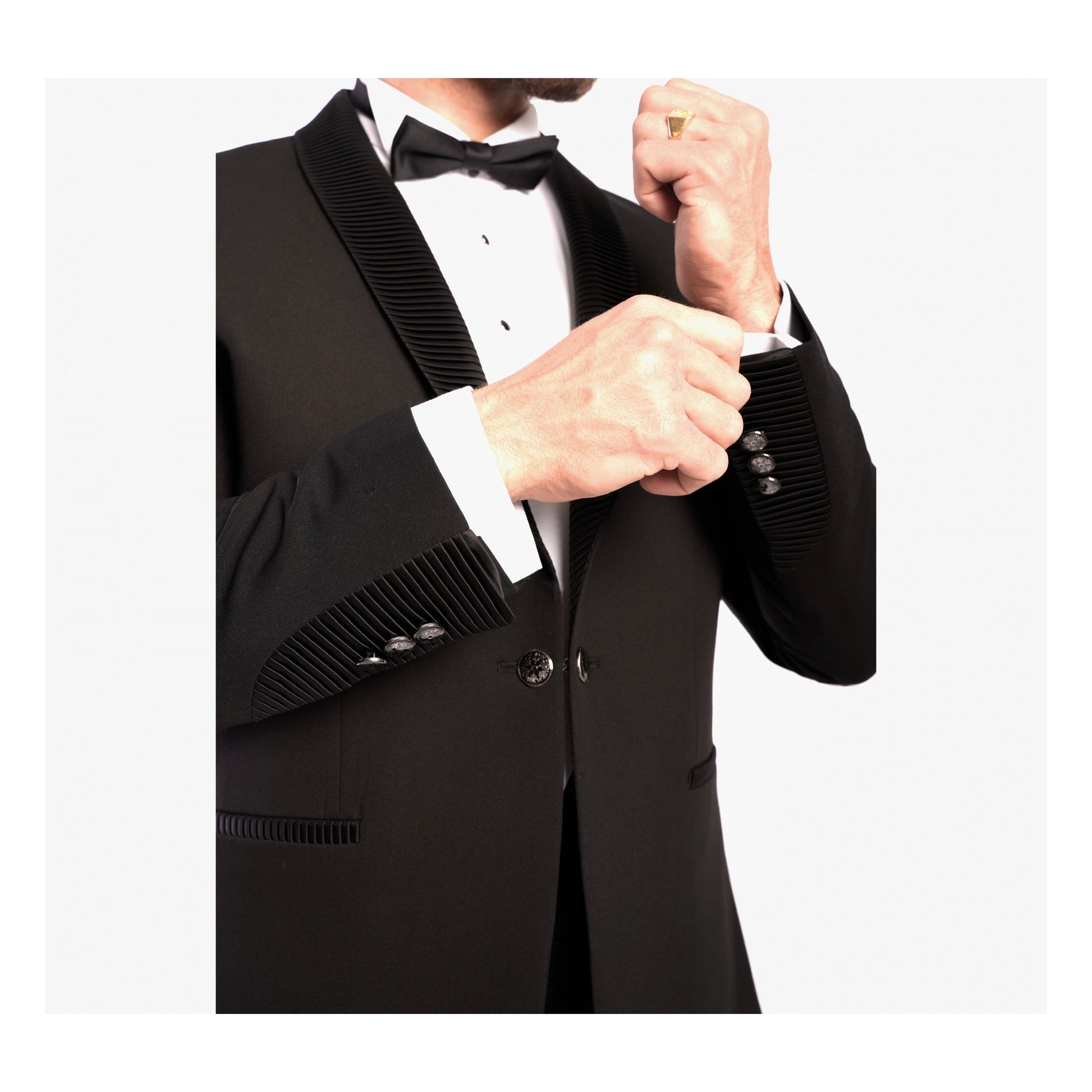 Dieser Smoking aus Wollmischung verfügt über Lycra für optimalen Komfort. Dieses körperbetonte Set besteht aus einer plissierten Satinjacke mit Schalkragen und zwei Pattentaschen und einer Hose mit Reißverschluss und zwei italienischen Taschen.