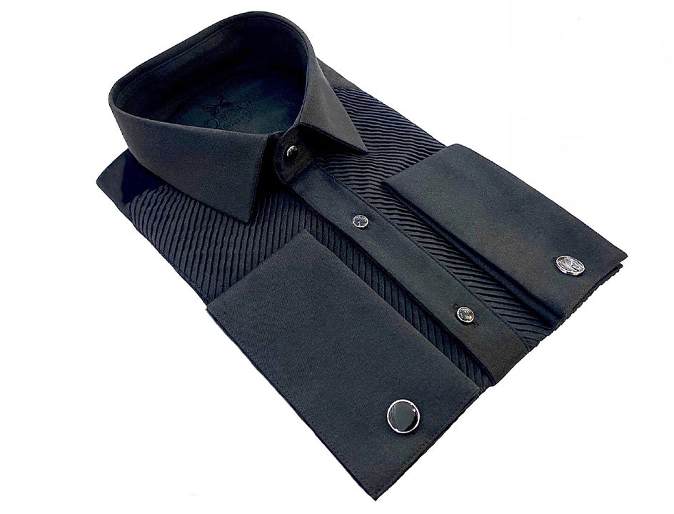 Dieses Hemd aus bügelleichtem Stoff verleiht Ihnen Eleganz und Komfort für alle Ihre besonderen Anlässe. Hemd mit französischem Kragen, plissiertem Latz und sichtbaren schwarzen Metallknöpfen. Musketiergriff mit abnehmbarem schwarzem Metallknopf.
