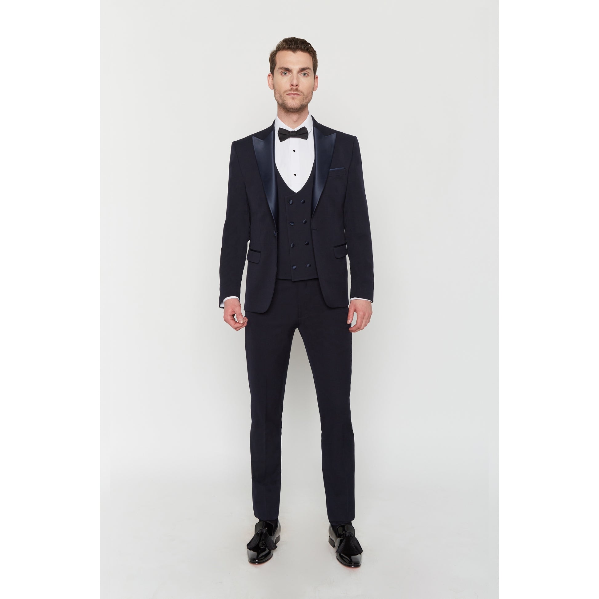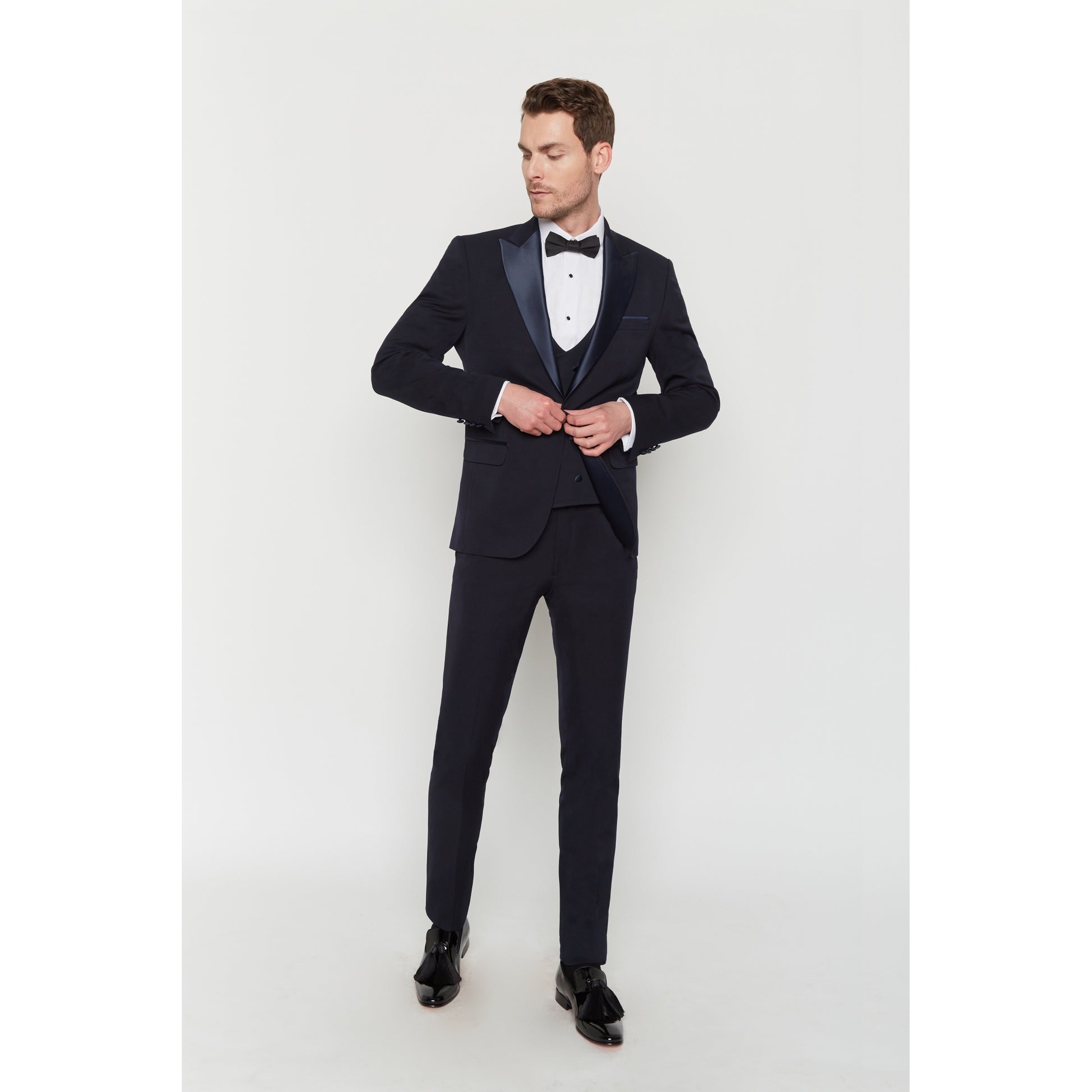 Dieser Smoking aus Wollmischung verfügt über Lycra für optimalen Komfort. Dieses körperbetonte Set besteht aus einer Satinjacke mit spitzem Kragen und zwei Pattentaschen und einer Hose mit Reißverschluss und zwei italienischen Taschen.