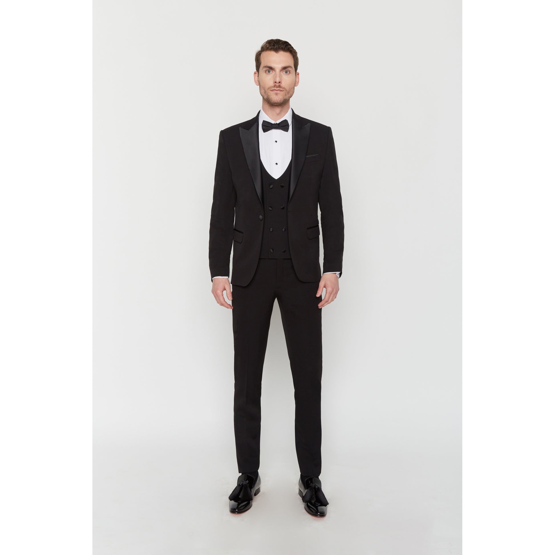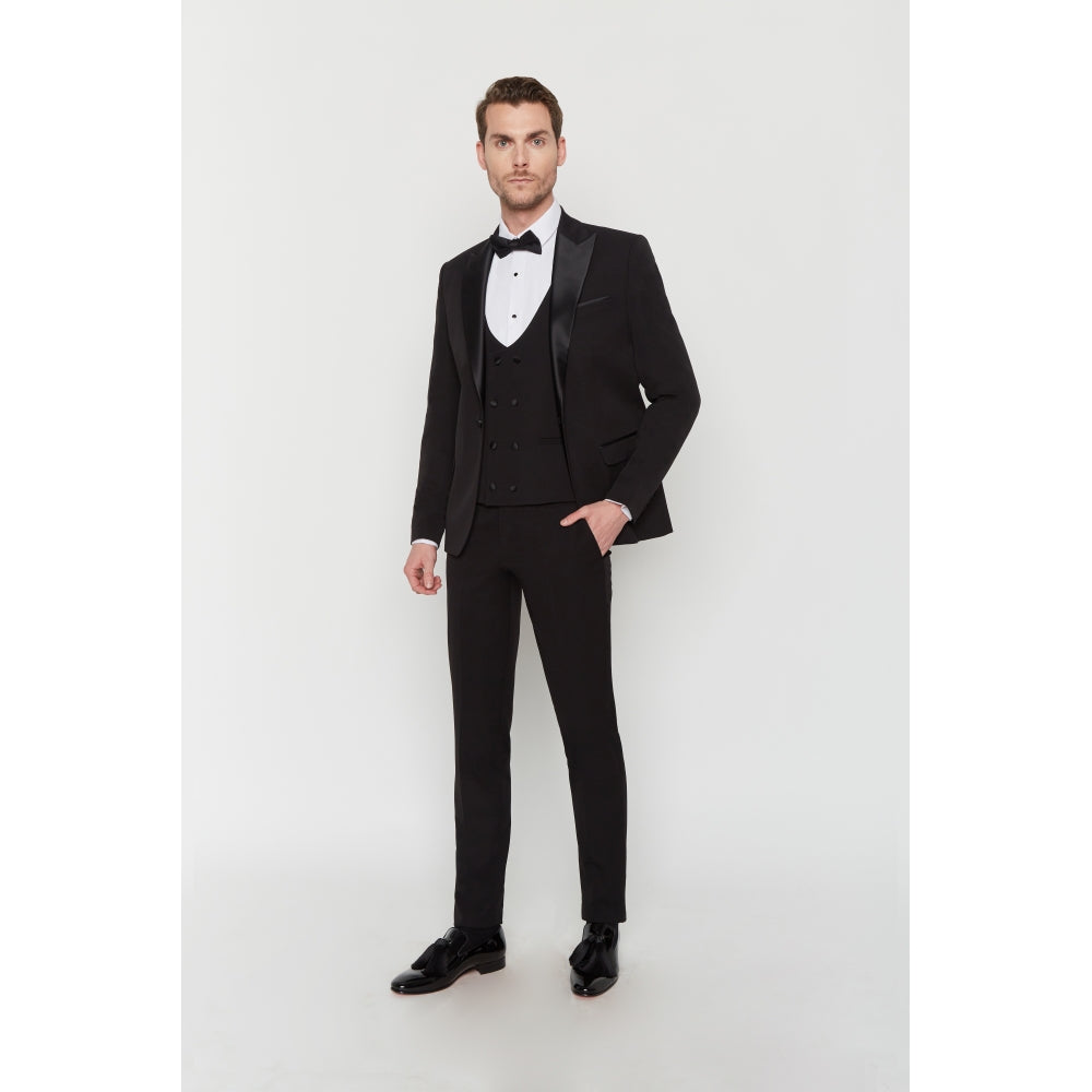 Dieser Smoking aus Wollmischung verfügt über Lycra für optimalen Komfort. Dieses körperbetonte Set besteht aus einer Satinjacke mit spitzem Kragen und zwei Pattentaschen und einer Hose mit Reißverschluss und zwei italienischen Taschen.
