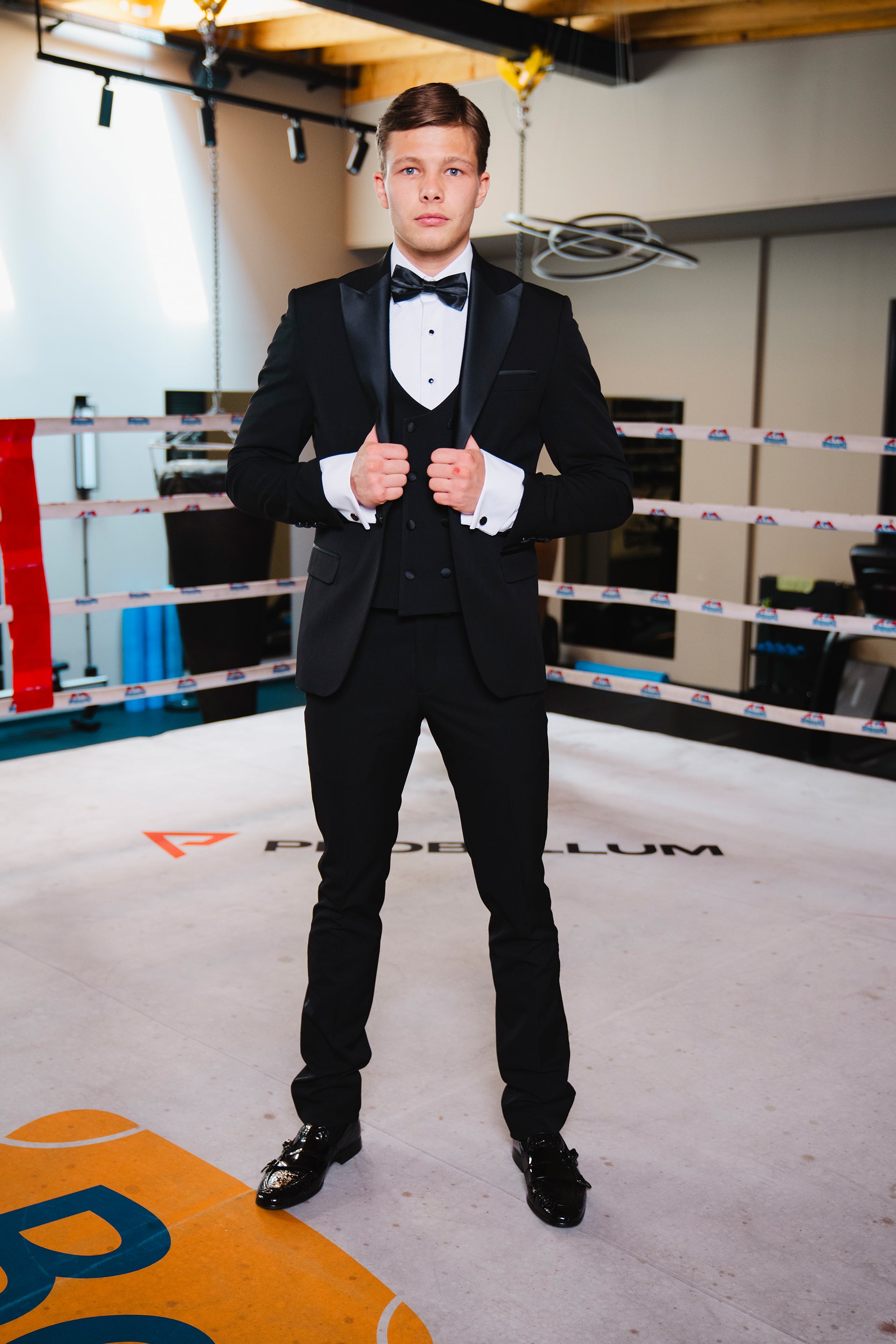 Dieser Smoking aus Wollmischung verfügt über Lycra für optimalen Komfort. Dieses körperbetonte Set besteht aus einer Satinjacke mit spitzem Kragen und zwei Pattentaschen und einer Hose mit Reißverschluss und zwei italienischen Taschen.