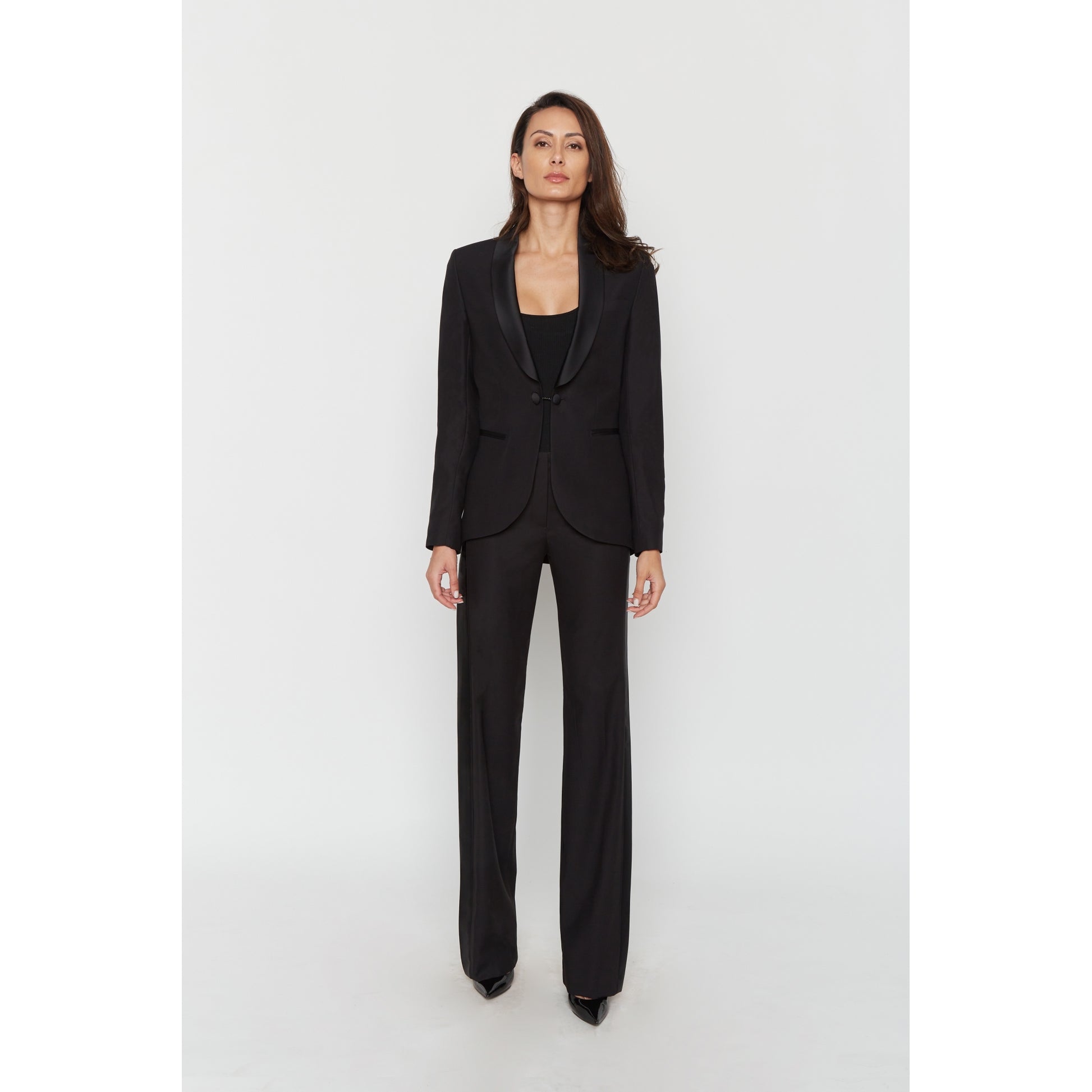 Smoking-Set bestehend aus einer Jacke, einem Schalkragen aus Satin, Paspeltaschen, verdeckten Knöpfen, etwas längerer Rückseite und einer geraden Hose, Seitentaschen und einem dünnen Satinband.