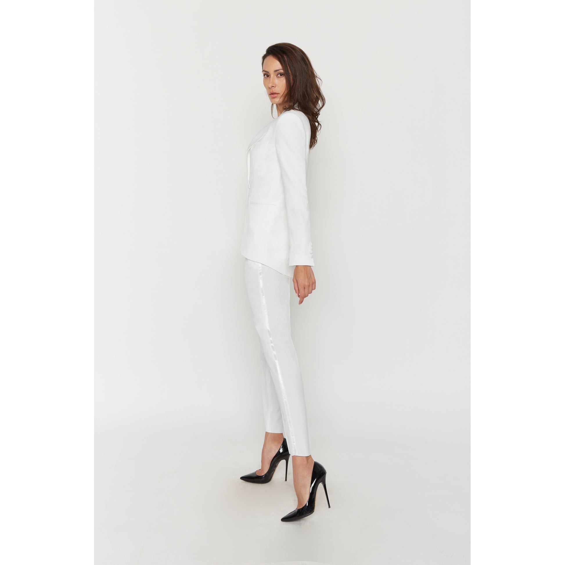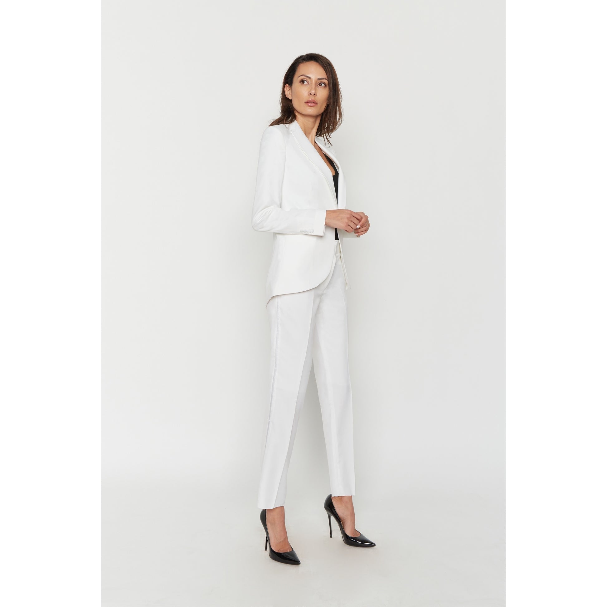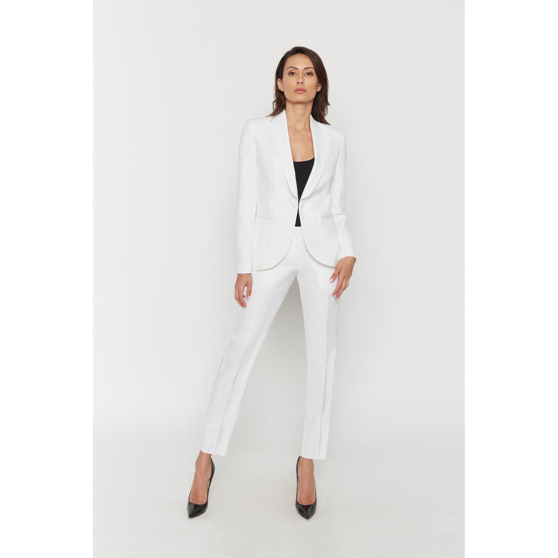 Smoking-Set bestehend aus Sakko, Satin-Schalkragen, Paspeltaschen, bezogenen Knöpfen, hinten etwas länger, und gerader Hose, eher weite Beine. Satinband an der Seite.