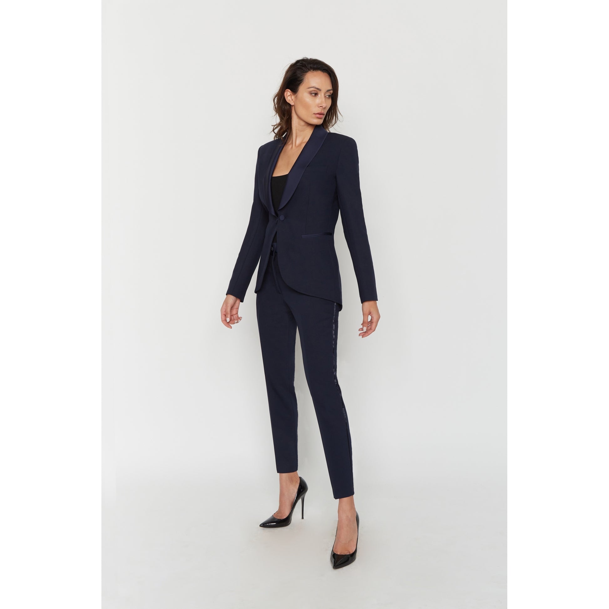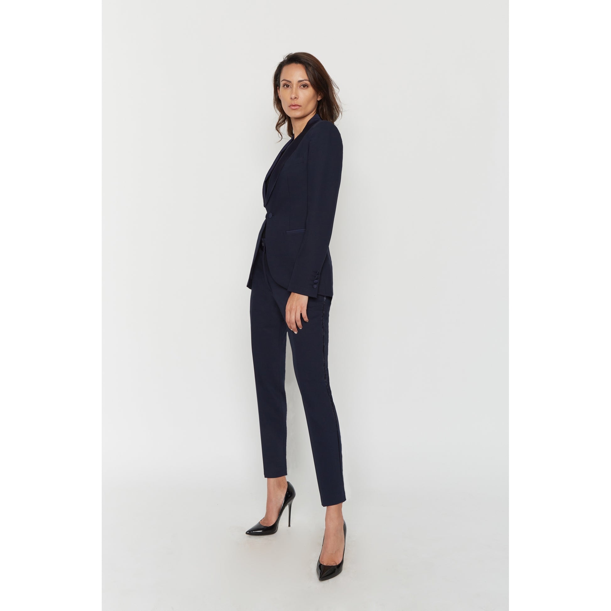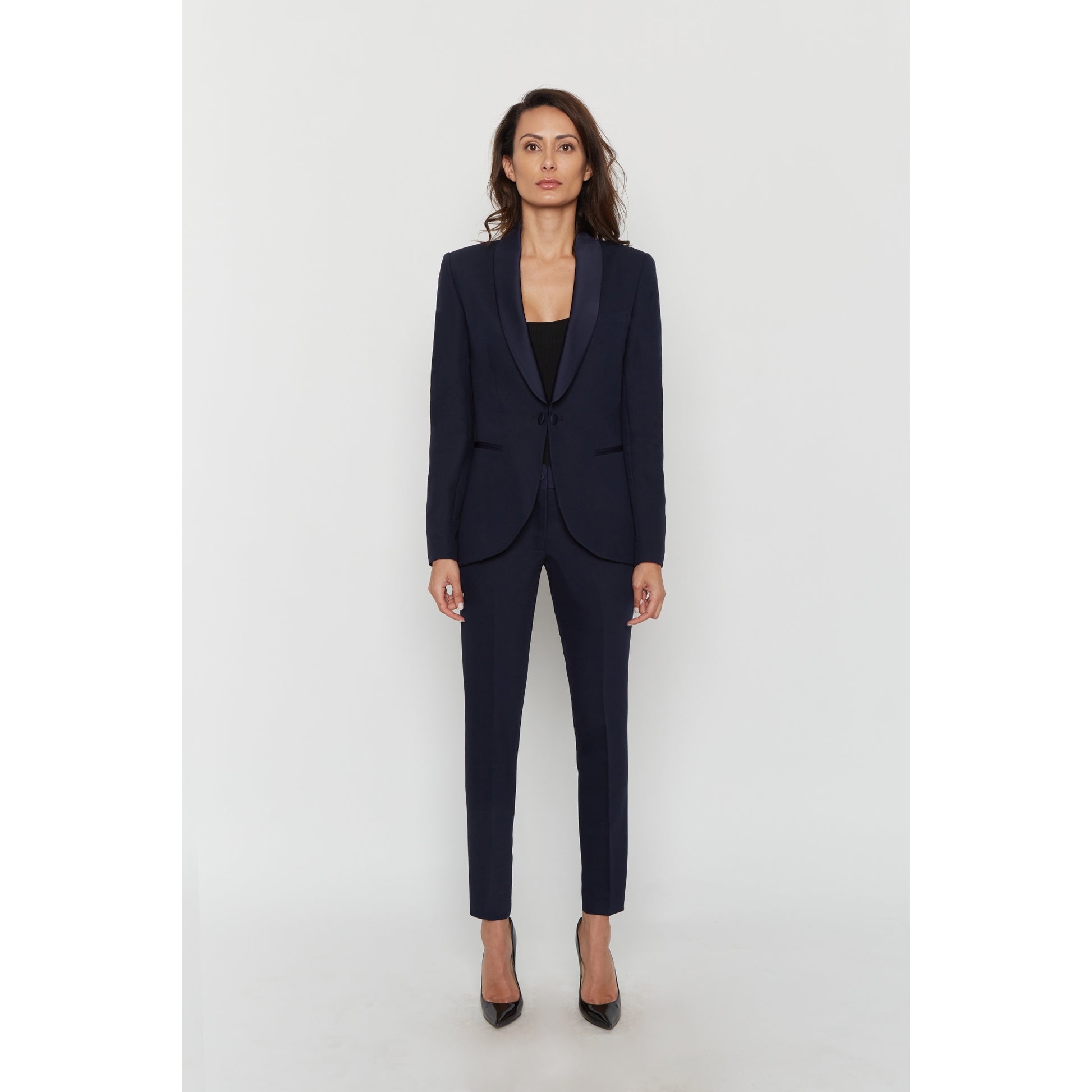 Smoking-Set bestehend aus einer Jacke, einem Schalkragen aus Satin, Paspeltaschen, verdeckten Knöpfen, etwas längerer Rückseite und einer geraden Hose, Seitentaschen und einem dünnen Satinband.