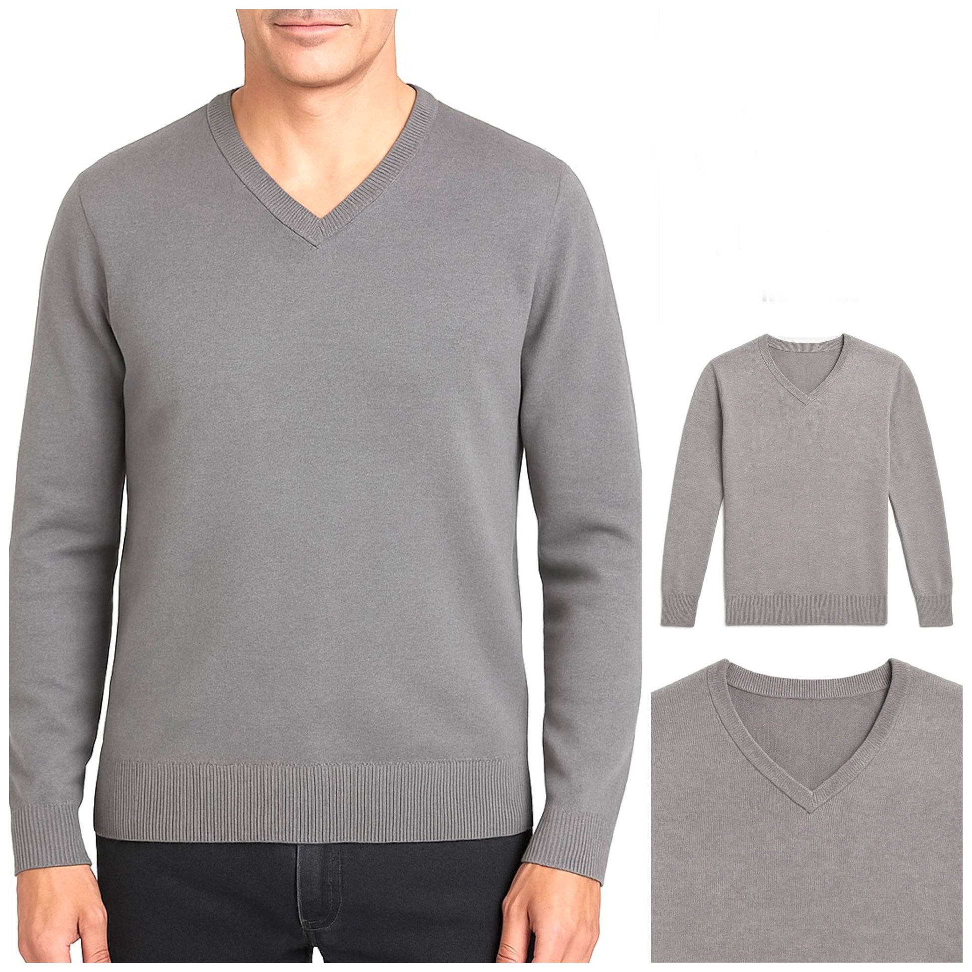 Grauer Strickpullover mit V-Ausschnitt