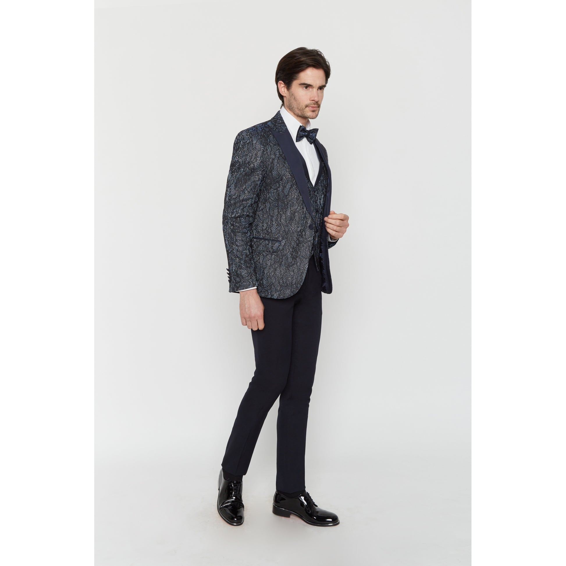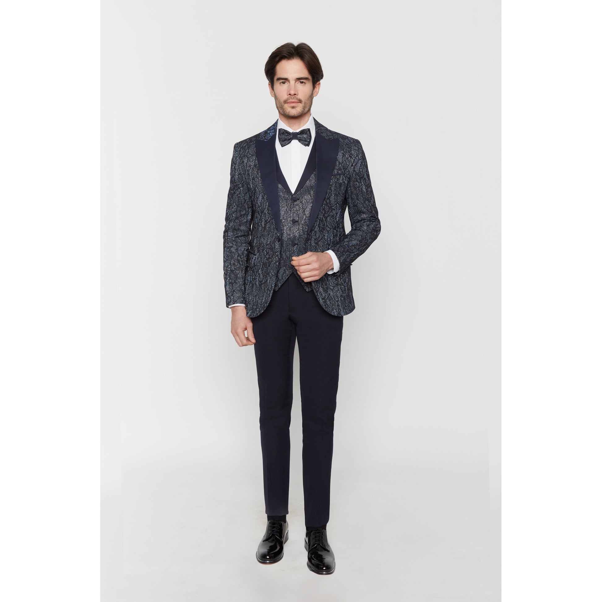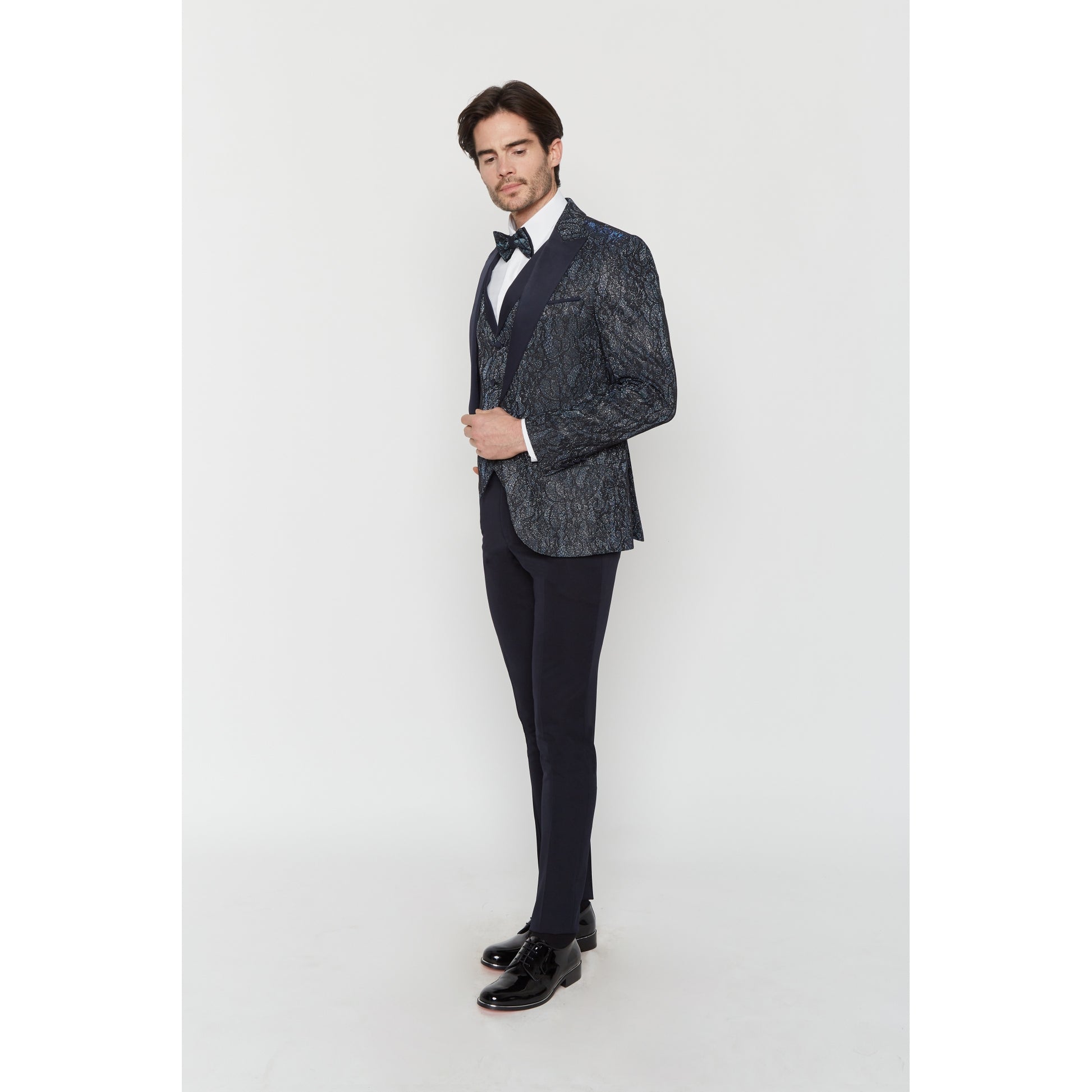 Modischer und extravaganter Smoking, schmaler Schnitt. Jacke mit spitzem Kragen, passender Weste, Fliege und schwarze Hose