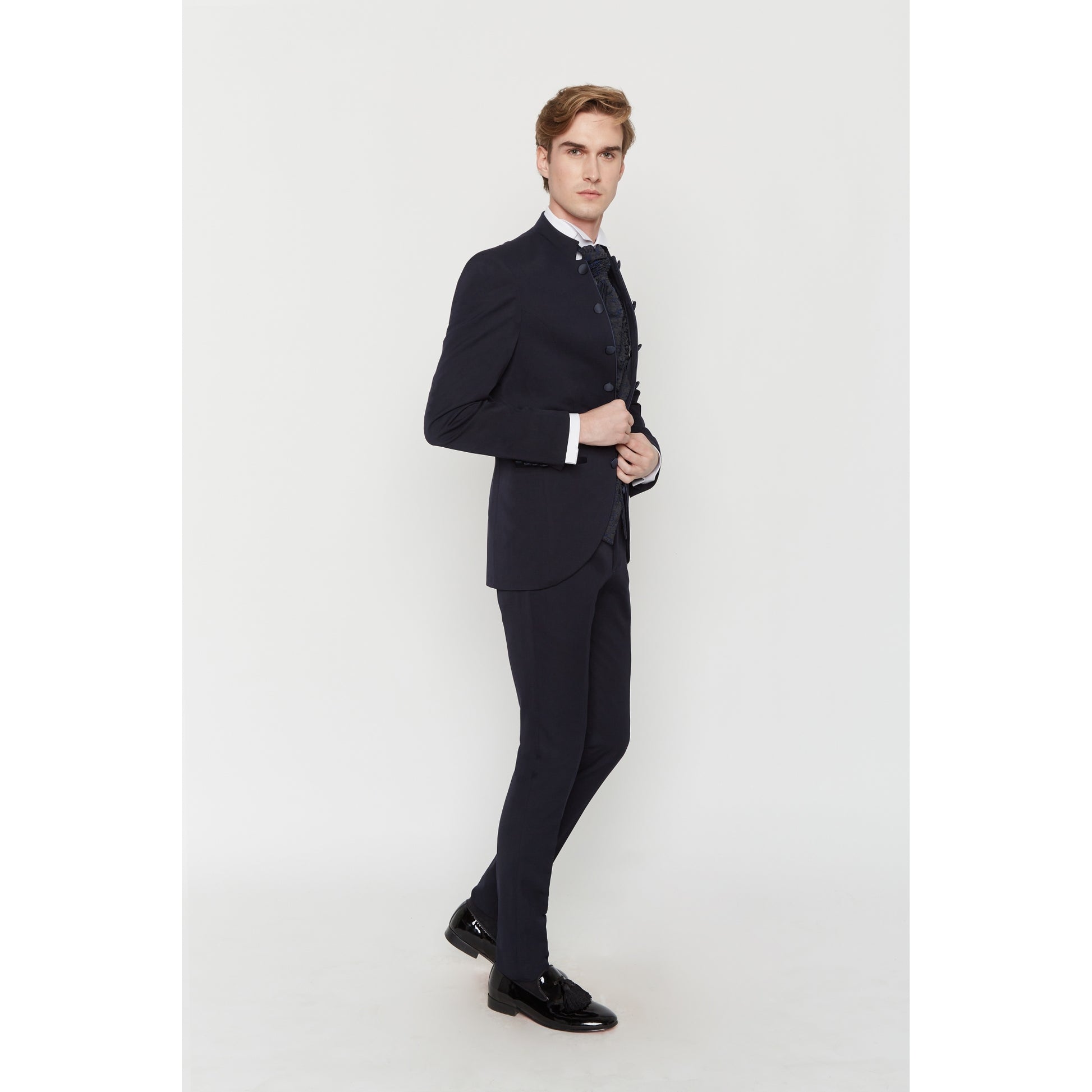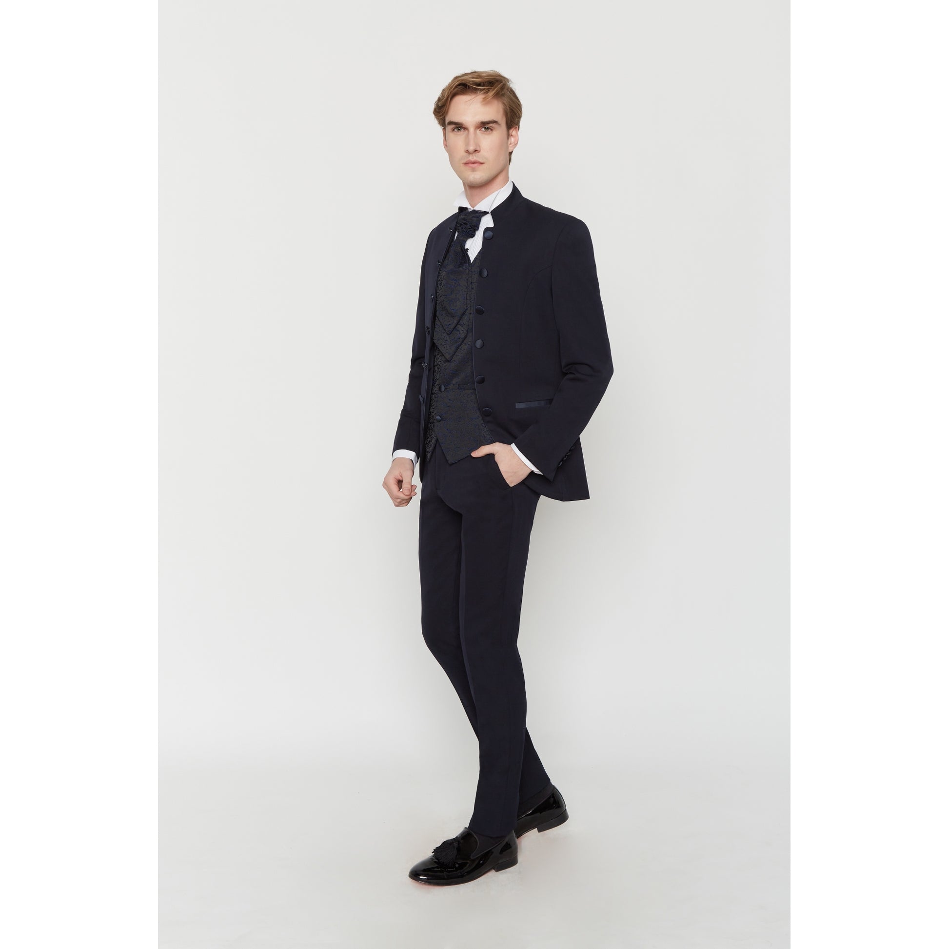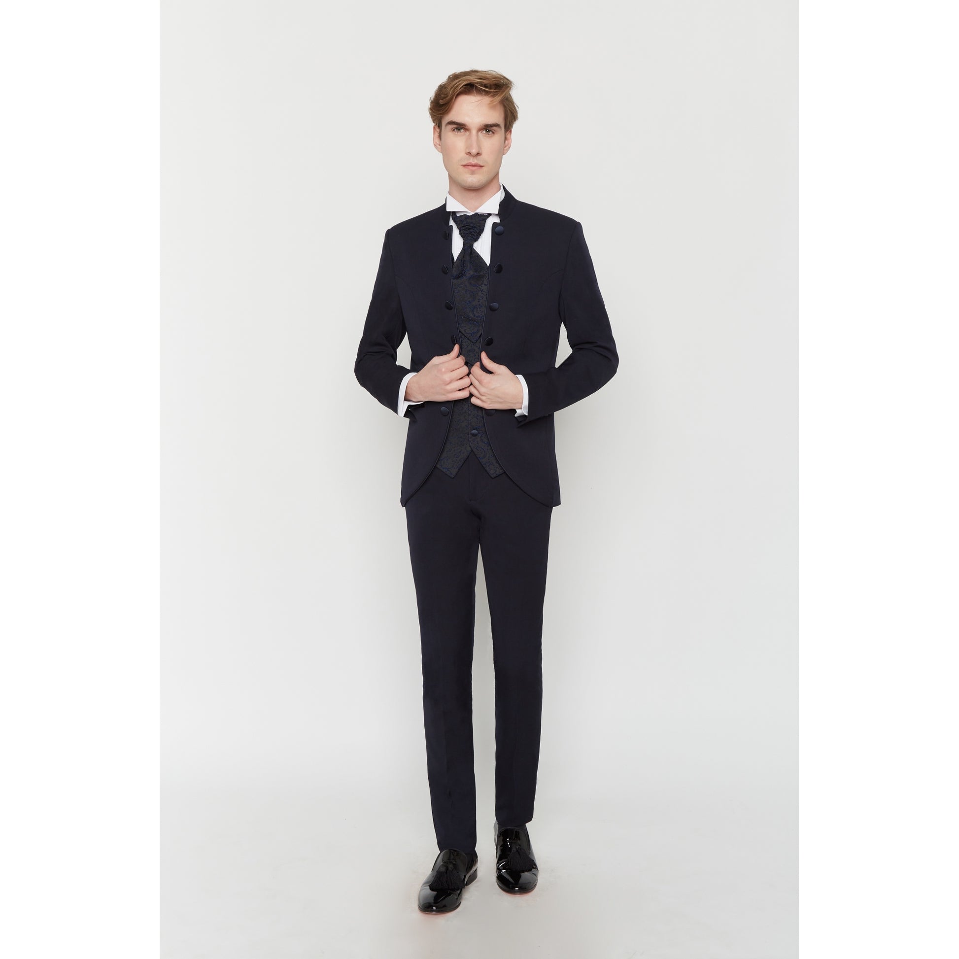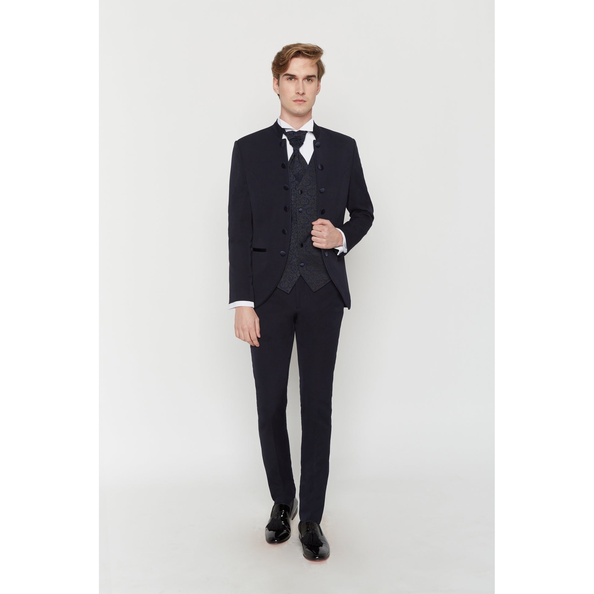 2-teiliges Sakko mit Mao-Kragen. Schmaler Schnitt, passende bestickte Weste und Ascot.