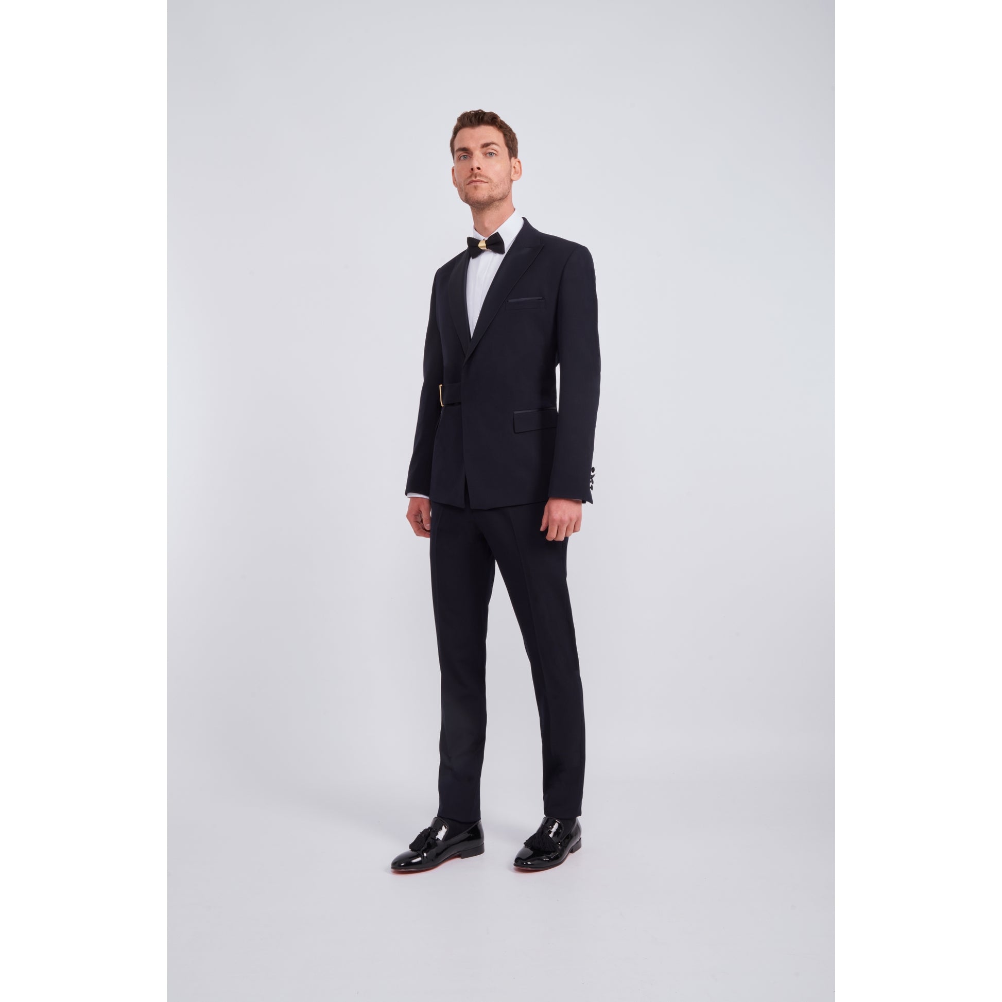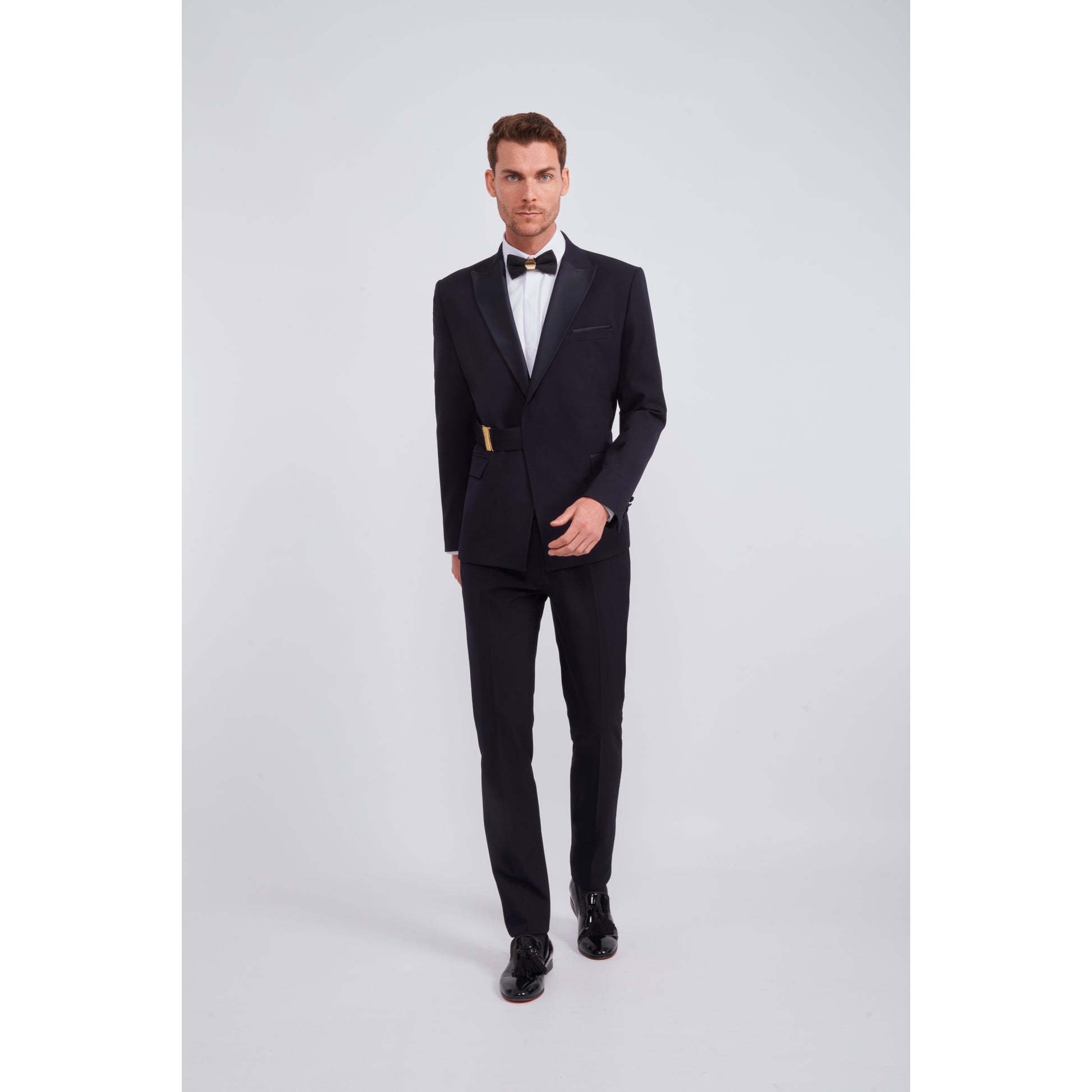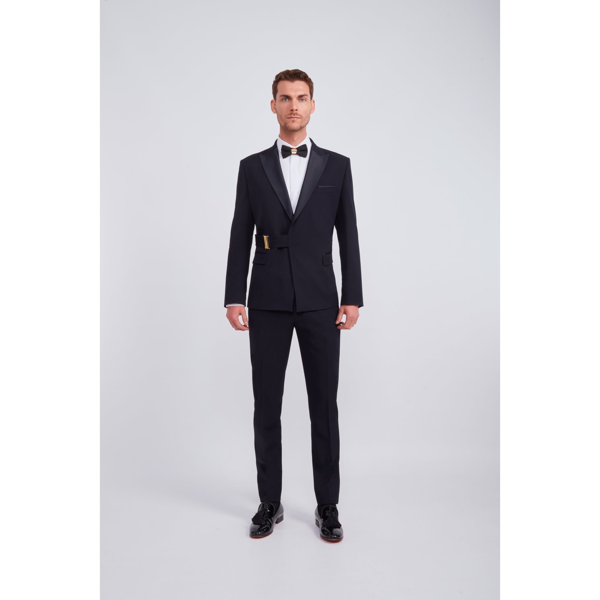 Zweiteiliger Smoking mit spitzem Kragen. taillierter Schnitt. Stoff aus Wolle und Lycra, angenehm zu tragen.