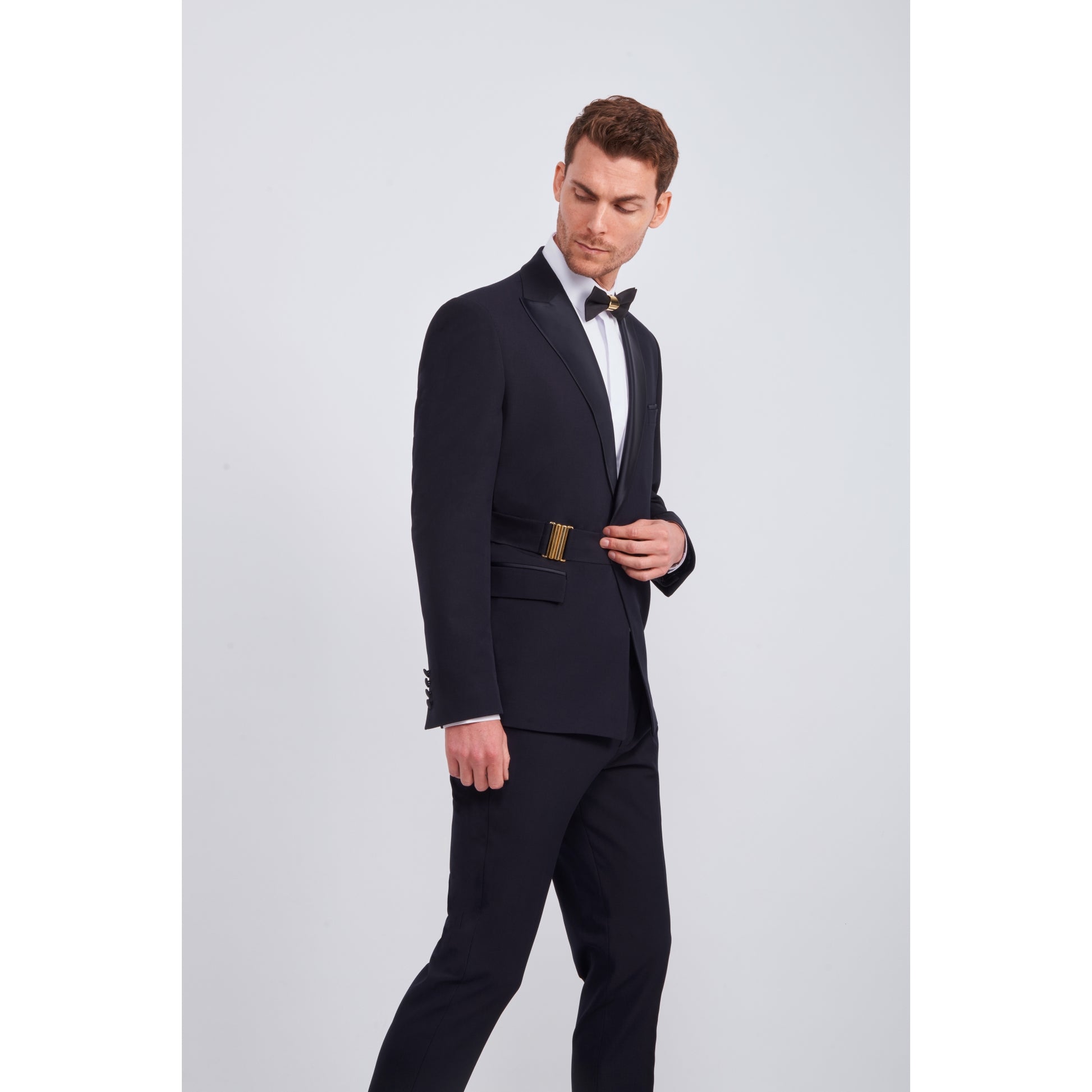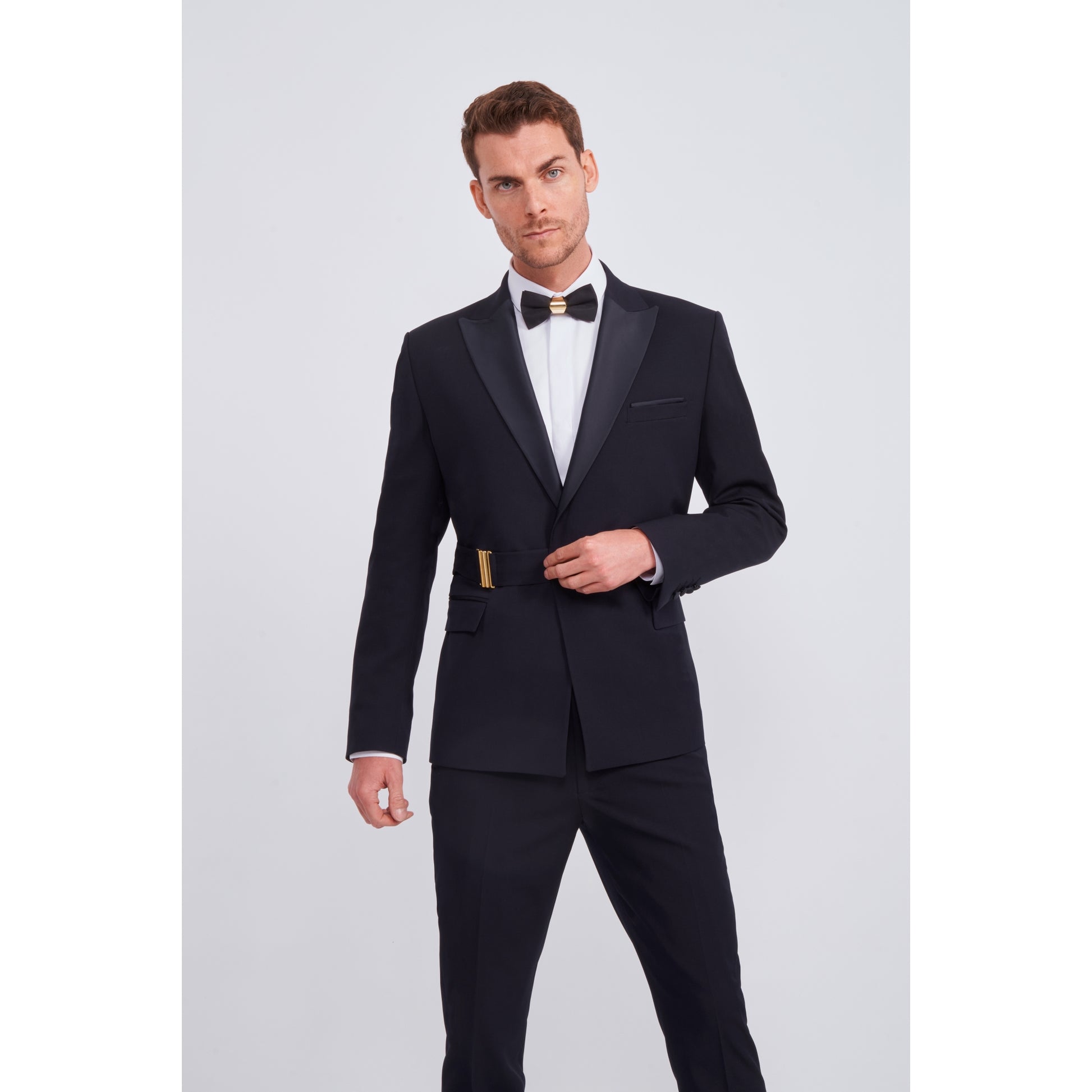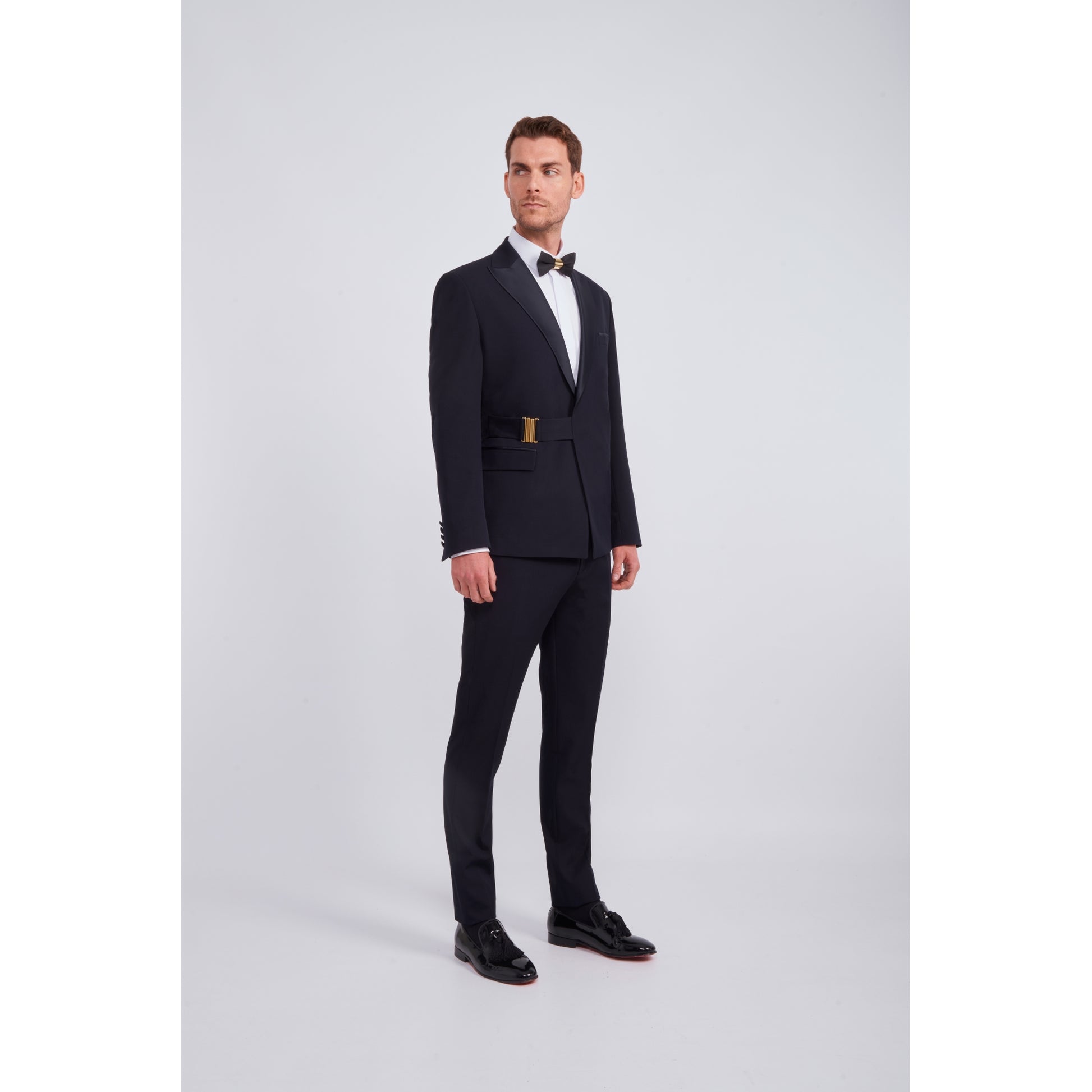 Zweiteiliger Smoking mit spitzem Kragen. taillierter Schnitt. Stoff aus Wolle und Lycra, angenehm zu tragen.