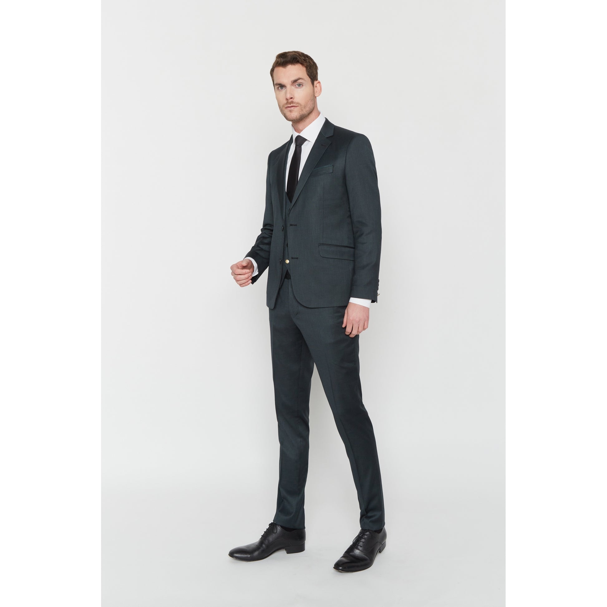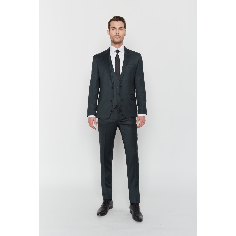 Dieser Anzug aus Wollmischung verfügt über Lycra für optimalen Komfort. Dieses körperbetonte Set besteht aus einer Jacke mit Reverskragen und 2 Pattentaschen auf der Vorderseite, einer Hose mit Reißverschluss und italienischer Tasche und einer passenden Weste.