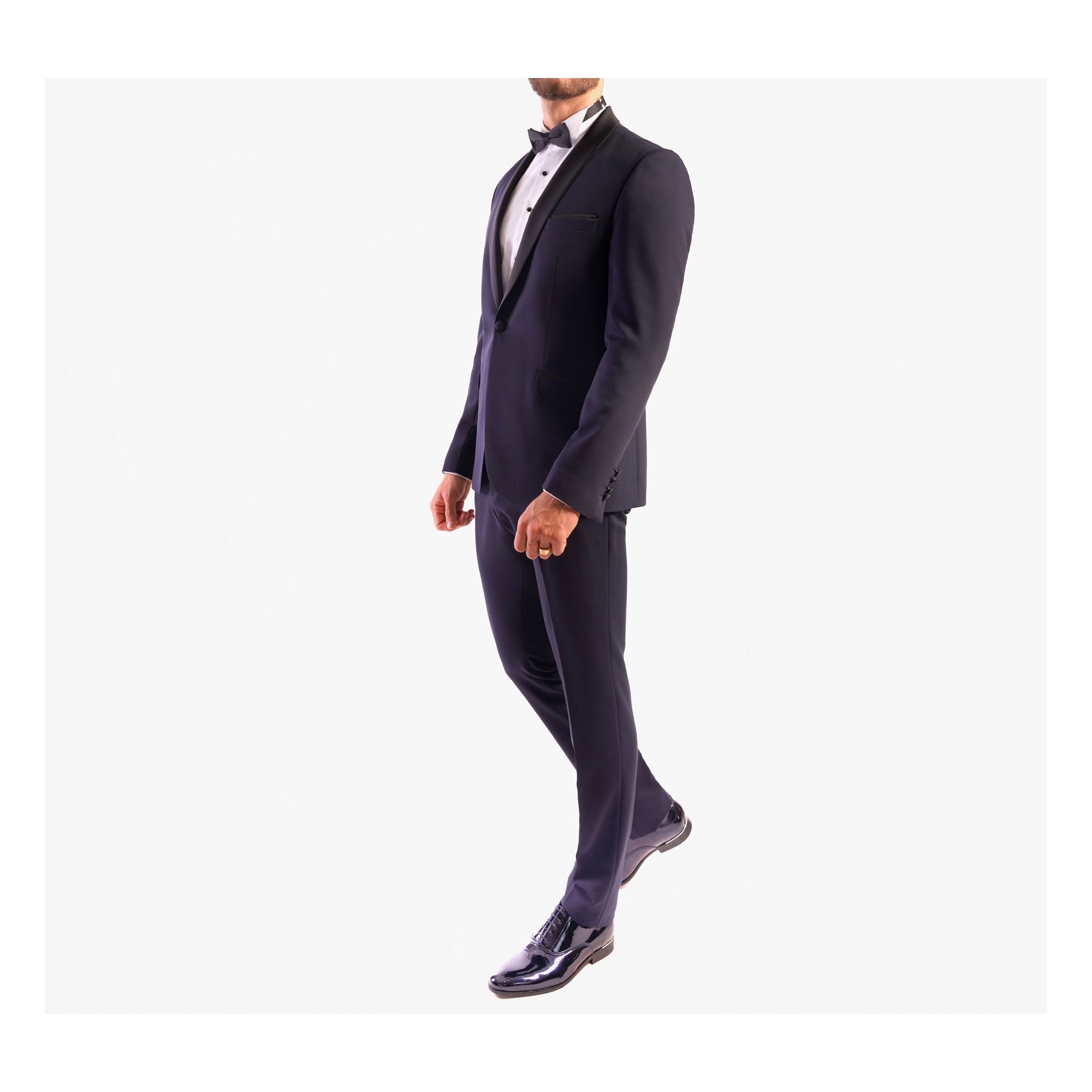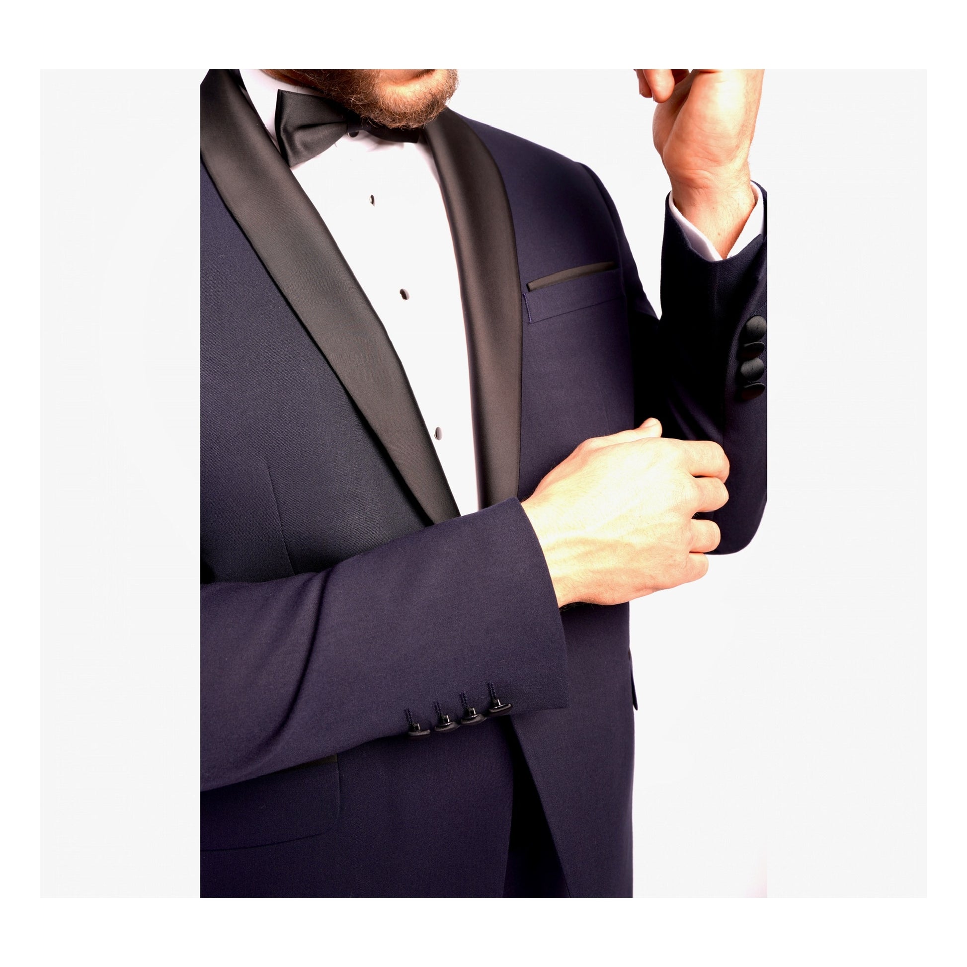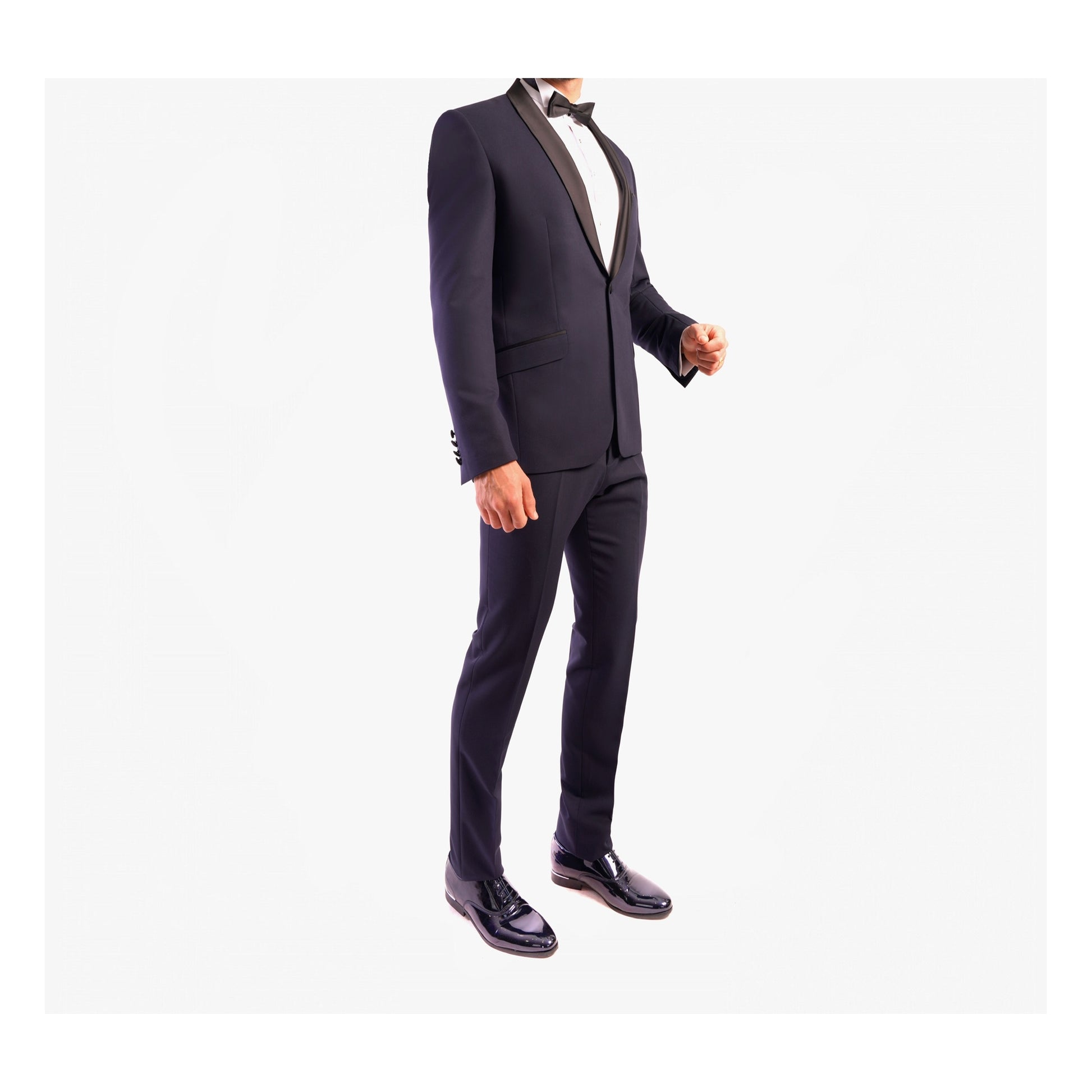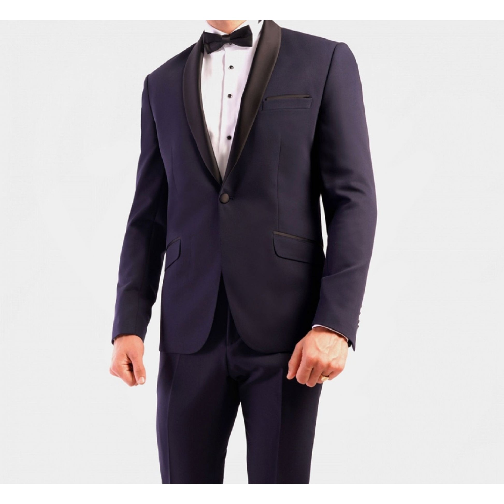 Dieser Smoking aus Wollmischung verfügt über Lycra für optimalen Komfort. Dieses körperbetonte Set besteht aus einer Satinjacke mit Schalkragen und 2 Pattentaschen und einer Hose mit Reißverschluss und 2 italienischen Taschen, die an den Seiten mit einem Satinstreifen (1 cm breit) versehen sind.