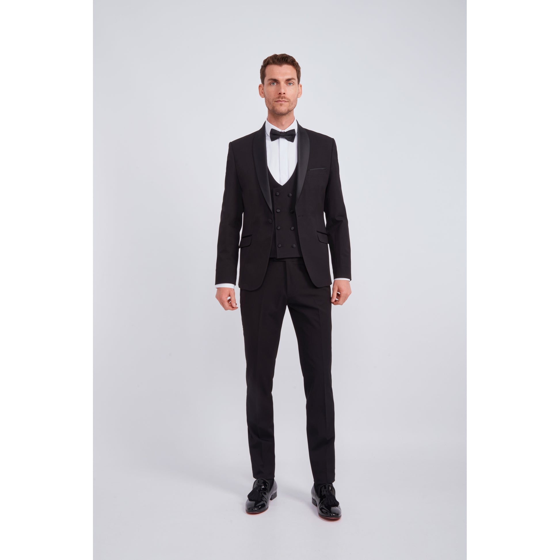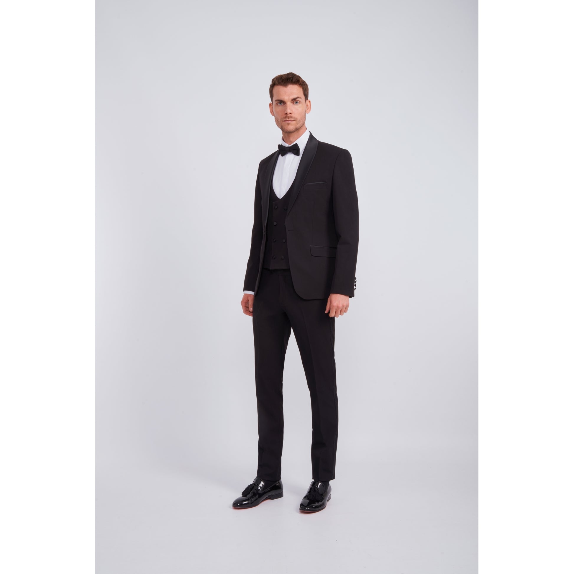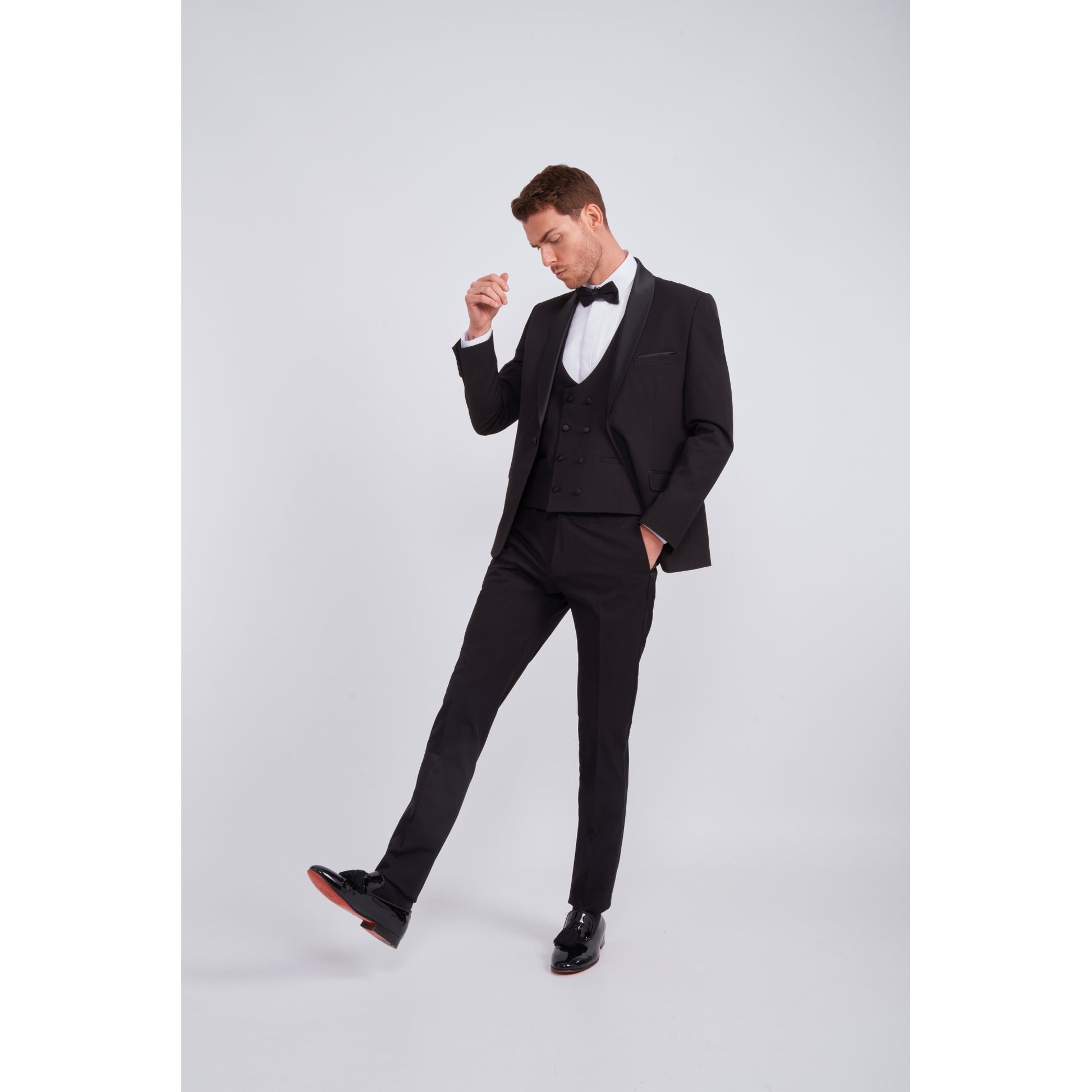 Dieser Smoking aus Wollmischung verfügt über Lycra für optimalen Komfort. Dieses tailliert geschnittene Set besteht aus einer Satinjacke mit Schalkragen und 2 Pattentaschen und einer Hose mit Reißverschluss, 2 italienischen Taschen und einem Satinstreifen (1 cm breit) an den Seiten.