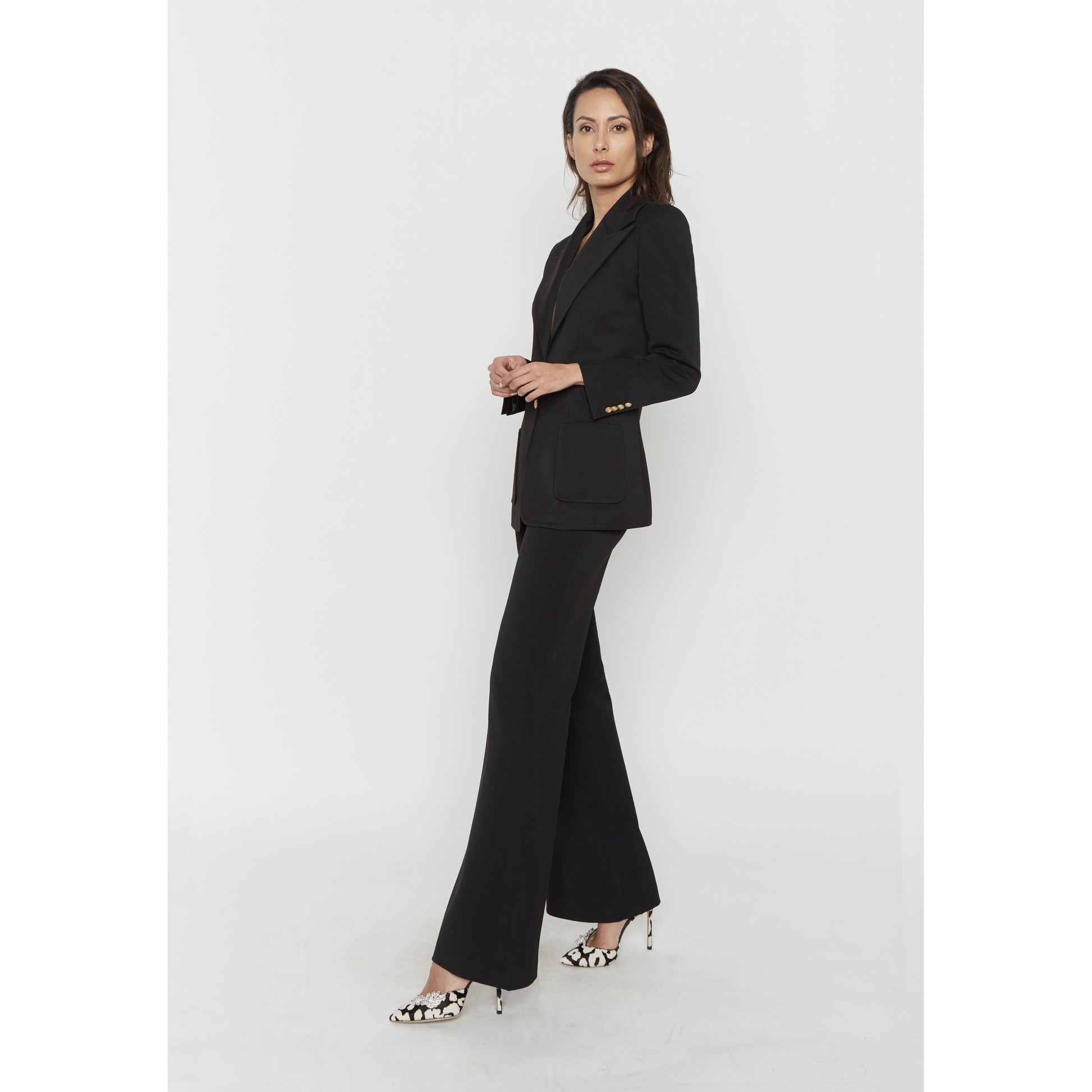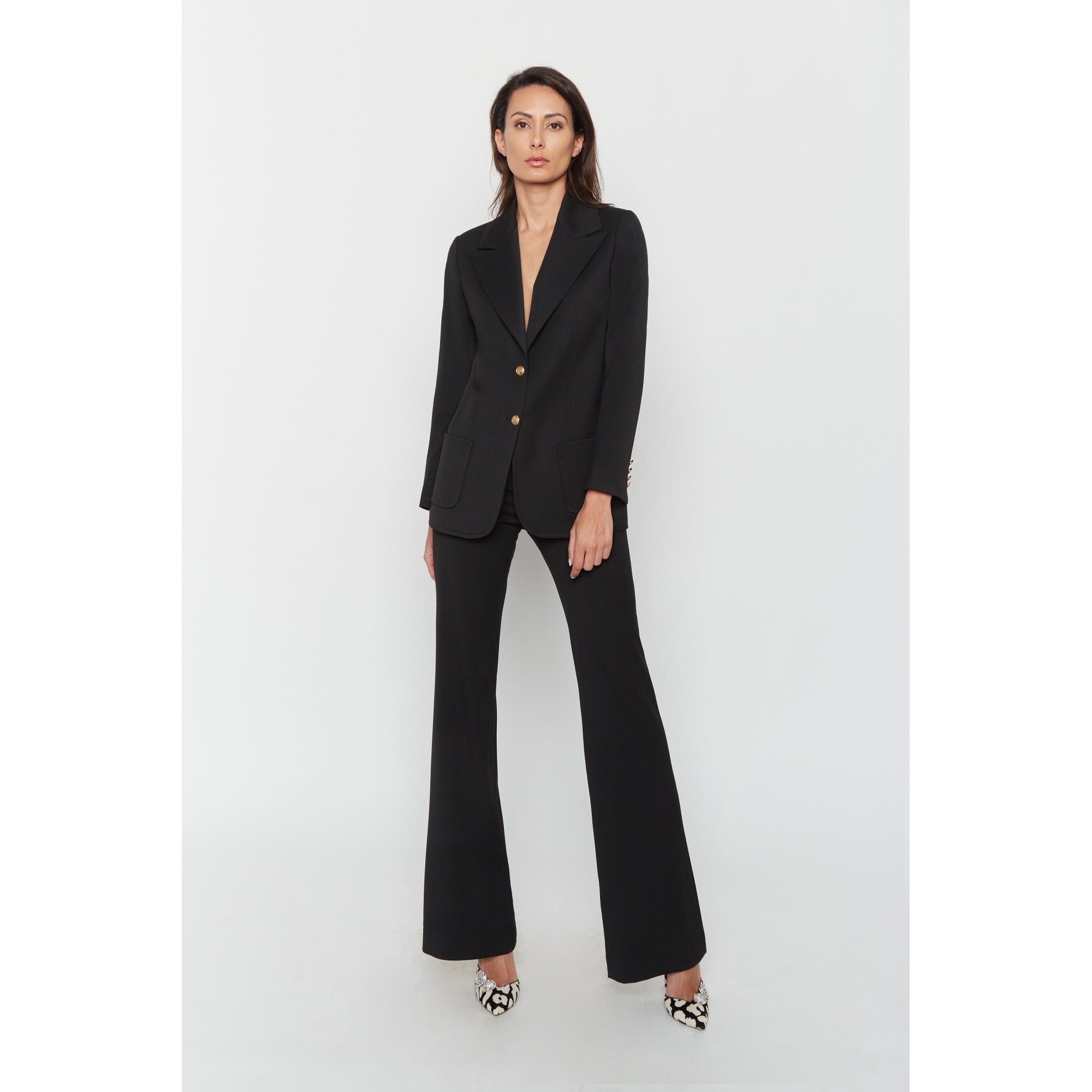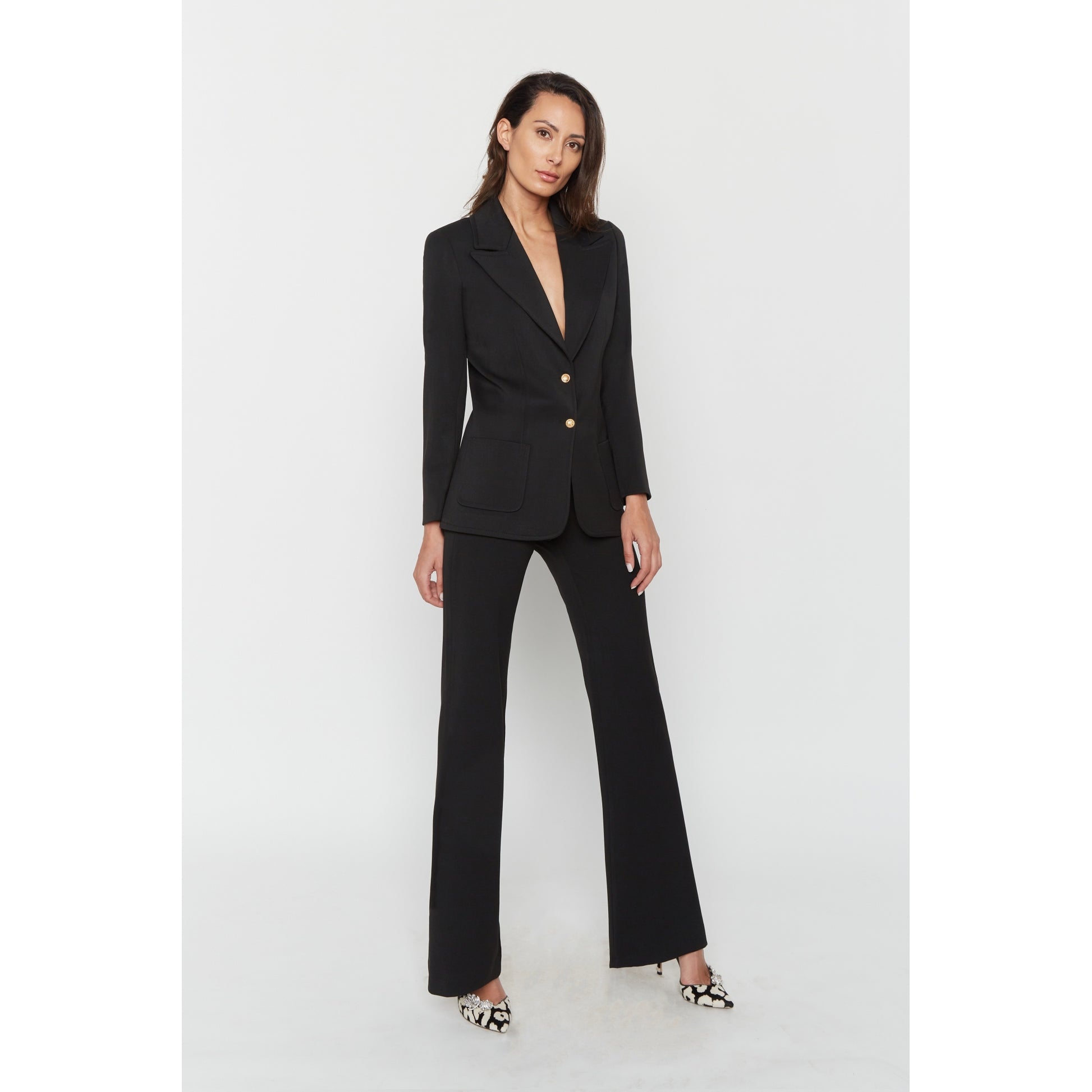 Set bestehend aus der Rachel-Jacke mit breitem Kragen im Stil der Siebzigerjahre, 2 aufgesetzten Taschen und goldenen Knöpfen. Die Vanessa-Hose hat einen hohen Bund und weite Beine.