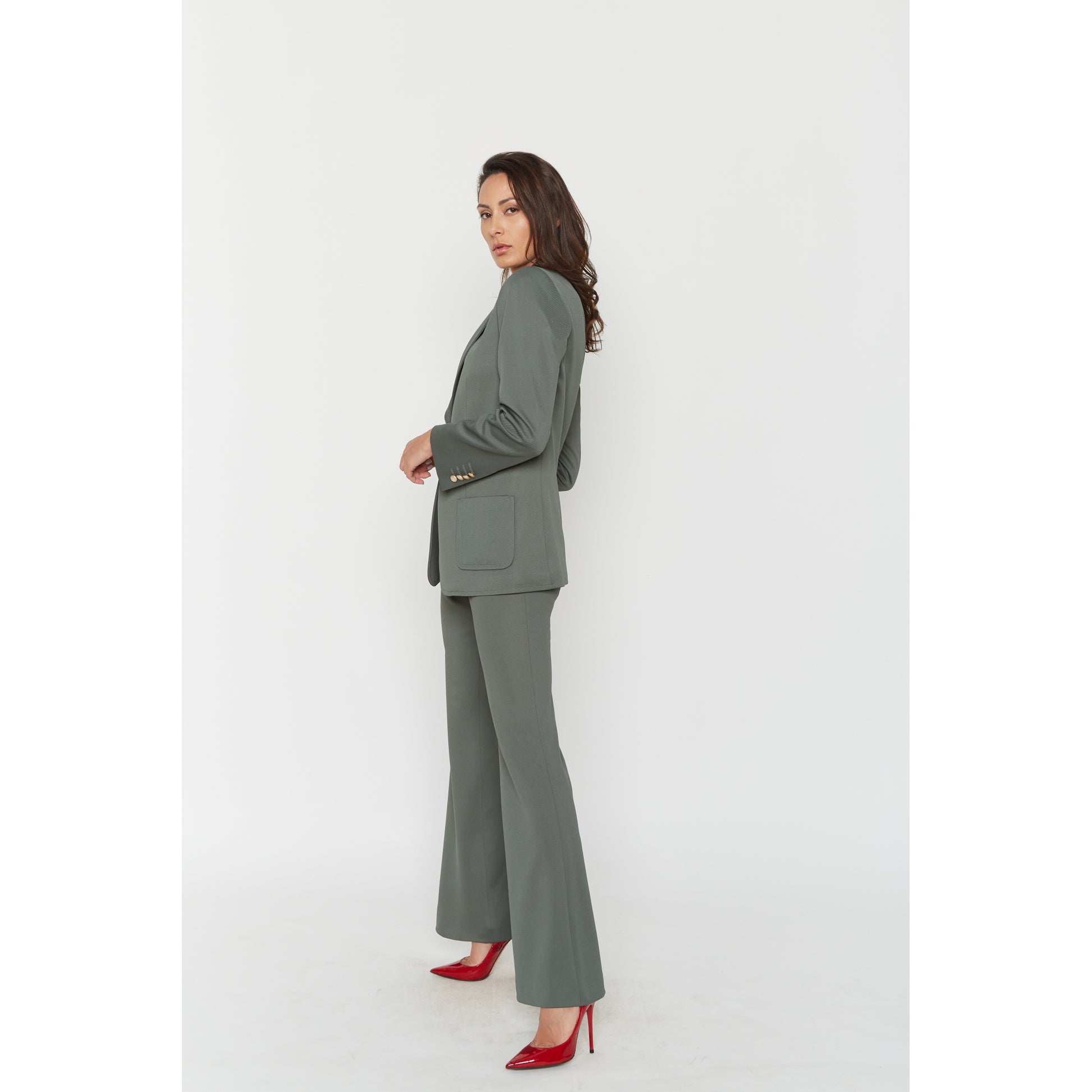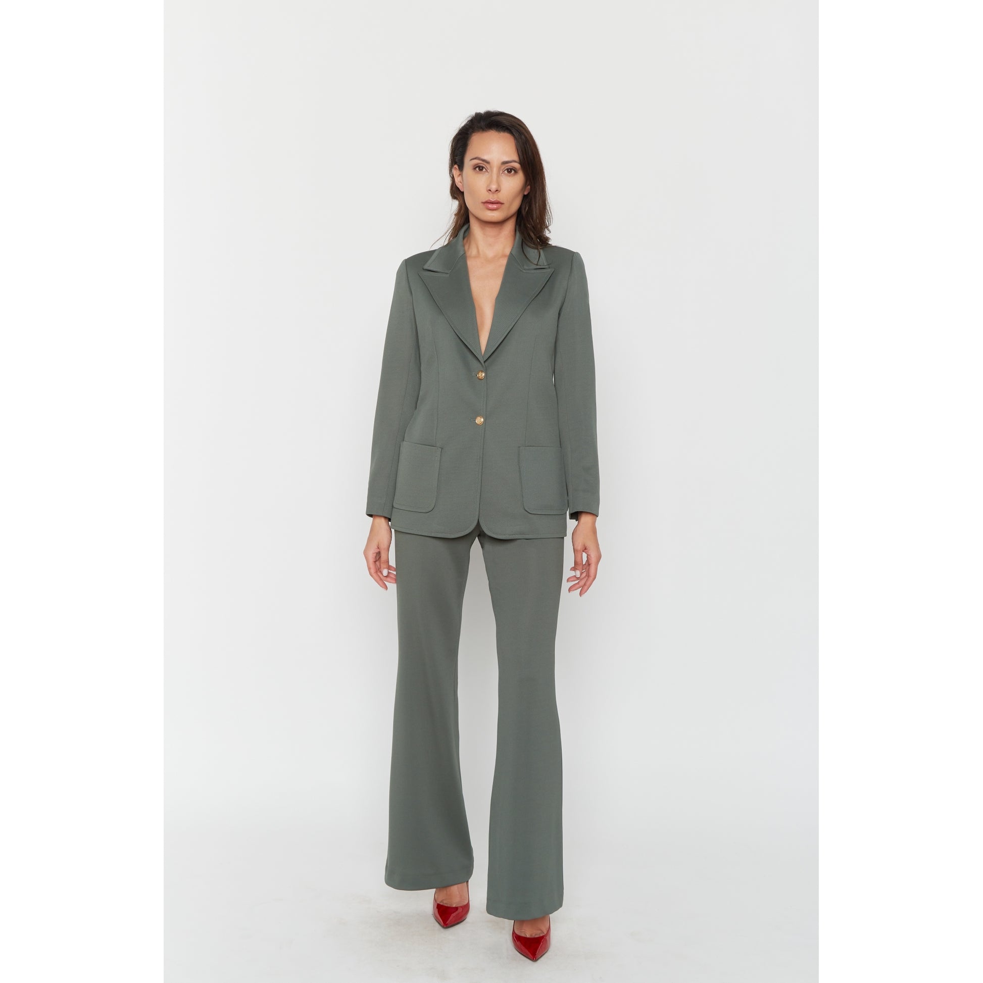 Set bestehend aus der Rachel-Jacke mit breitem Kragen im Stil der Siebzigerjahre, 2 aufgesetzten Taschen und goldenen Knöpfen. Die Vanessa-Hose hat einen hohen Bund und weite Beine.