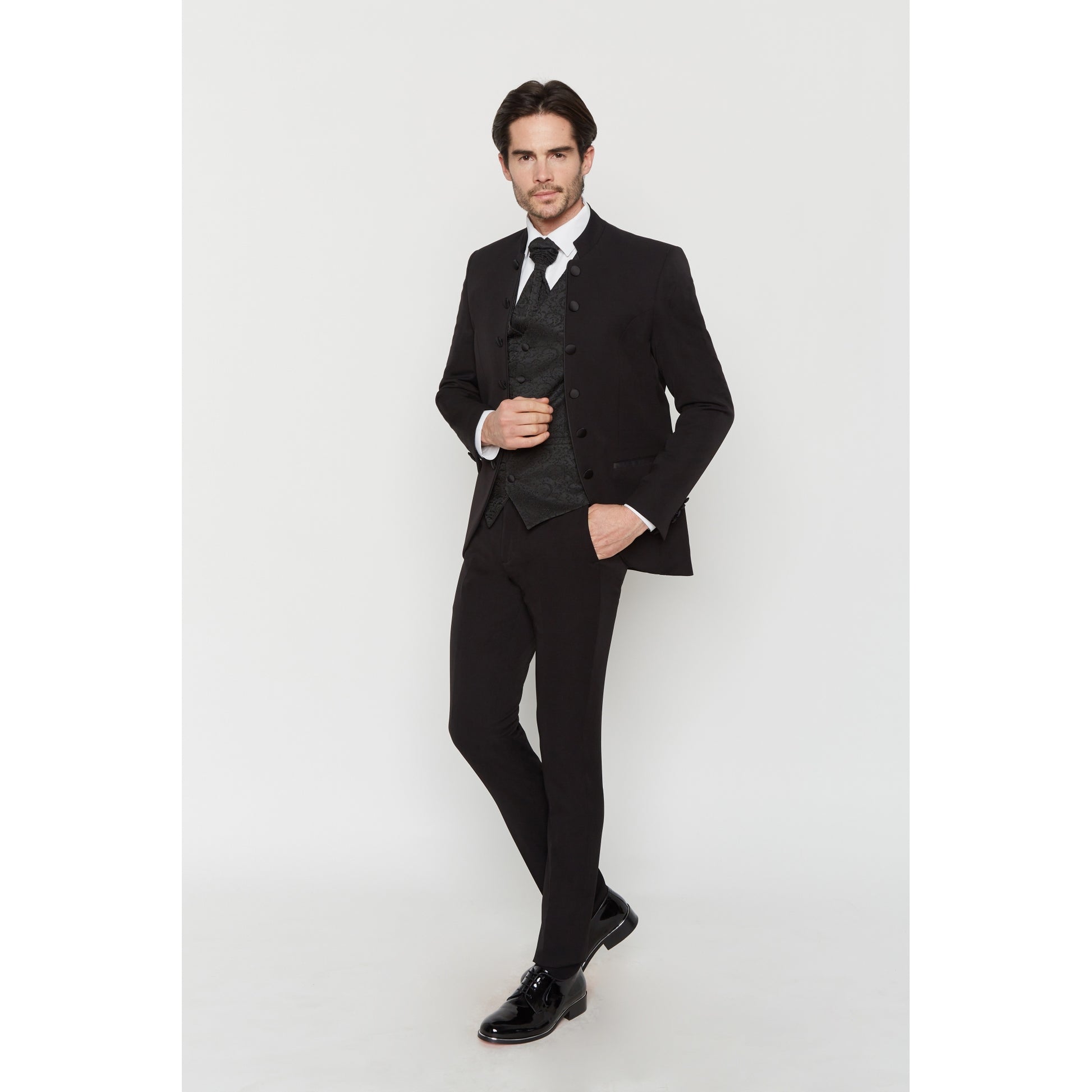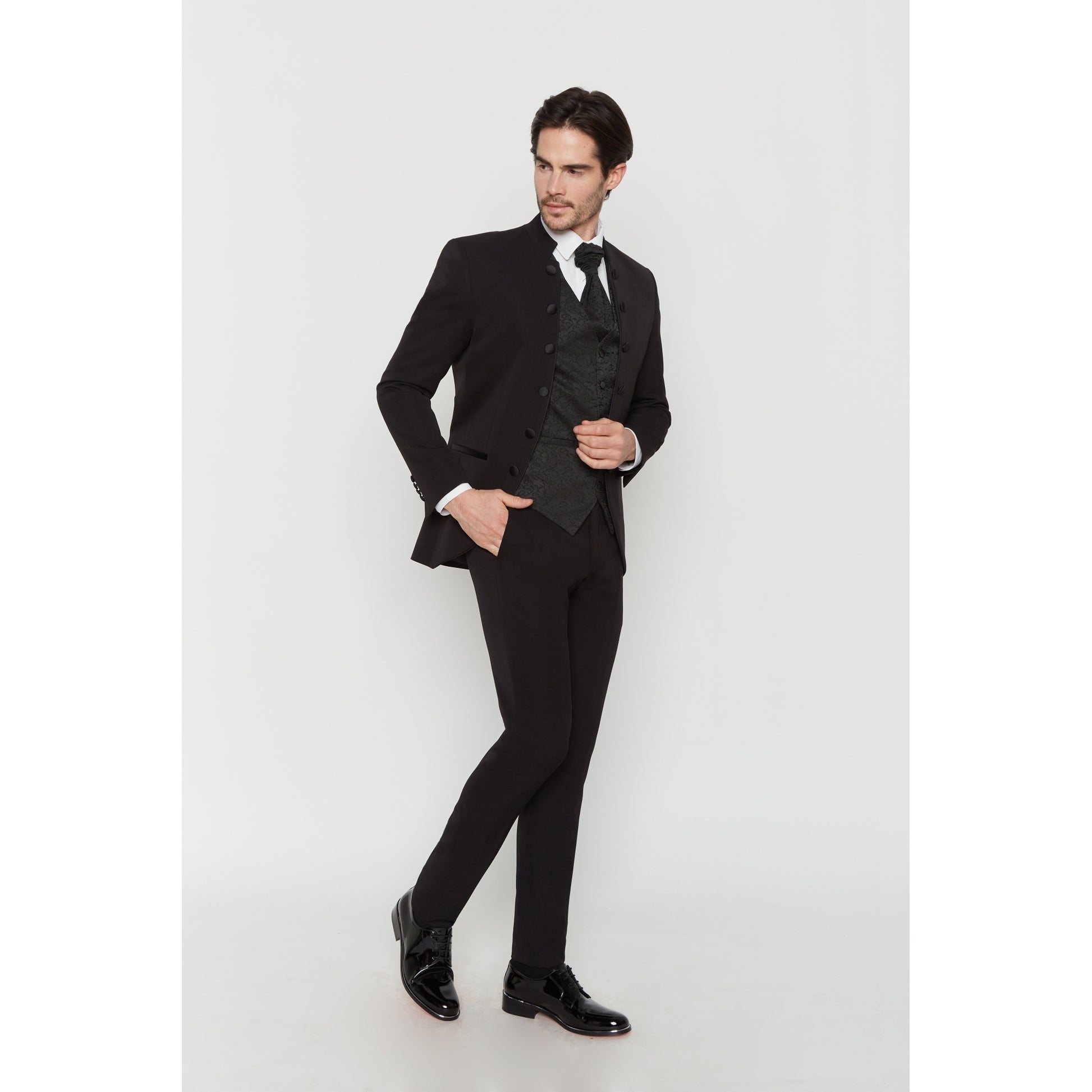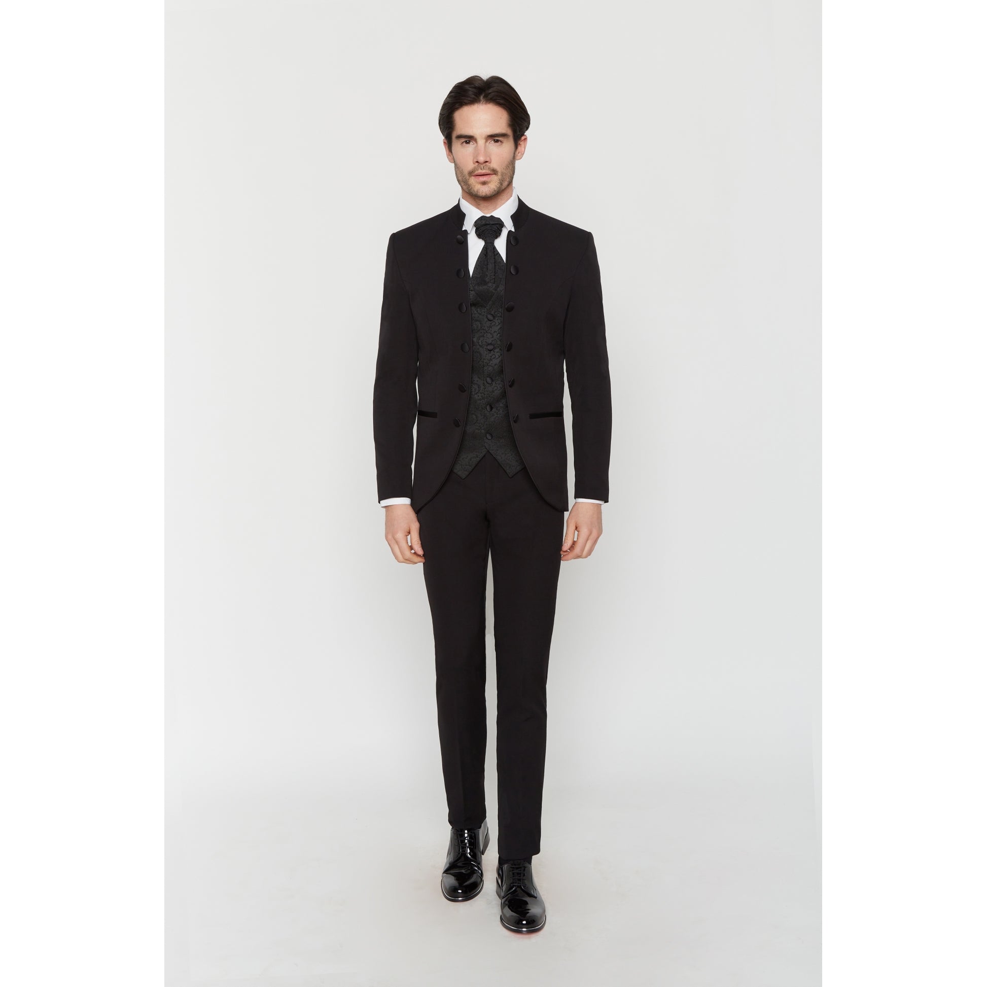 Sakko mit Mao-Kragen. Schmaler Schnitt, passende bestickte Weste und Ascot.