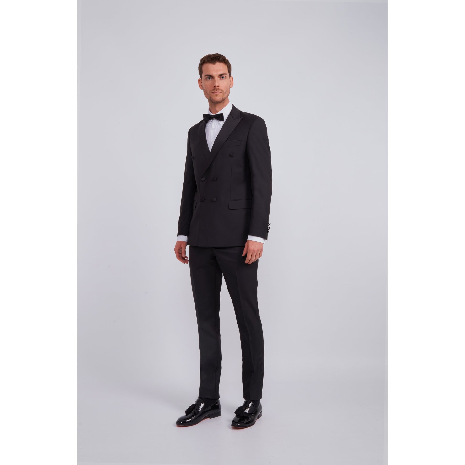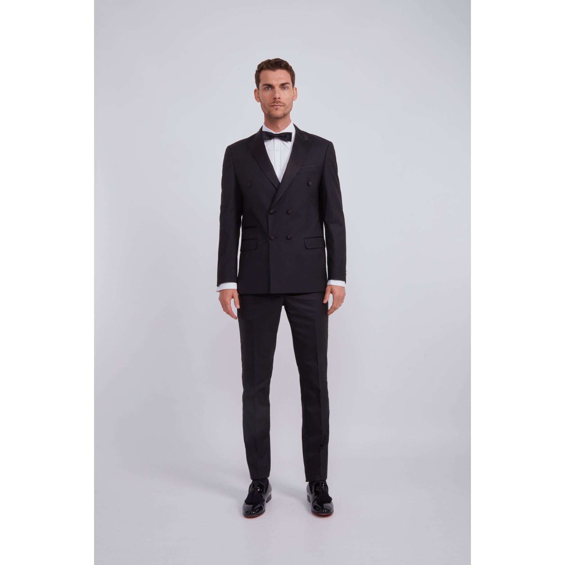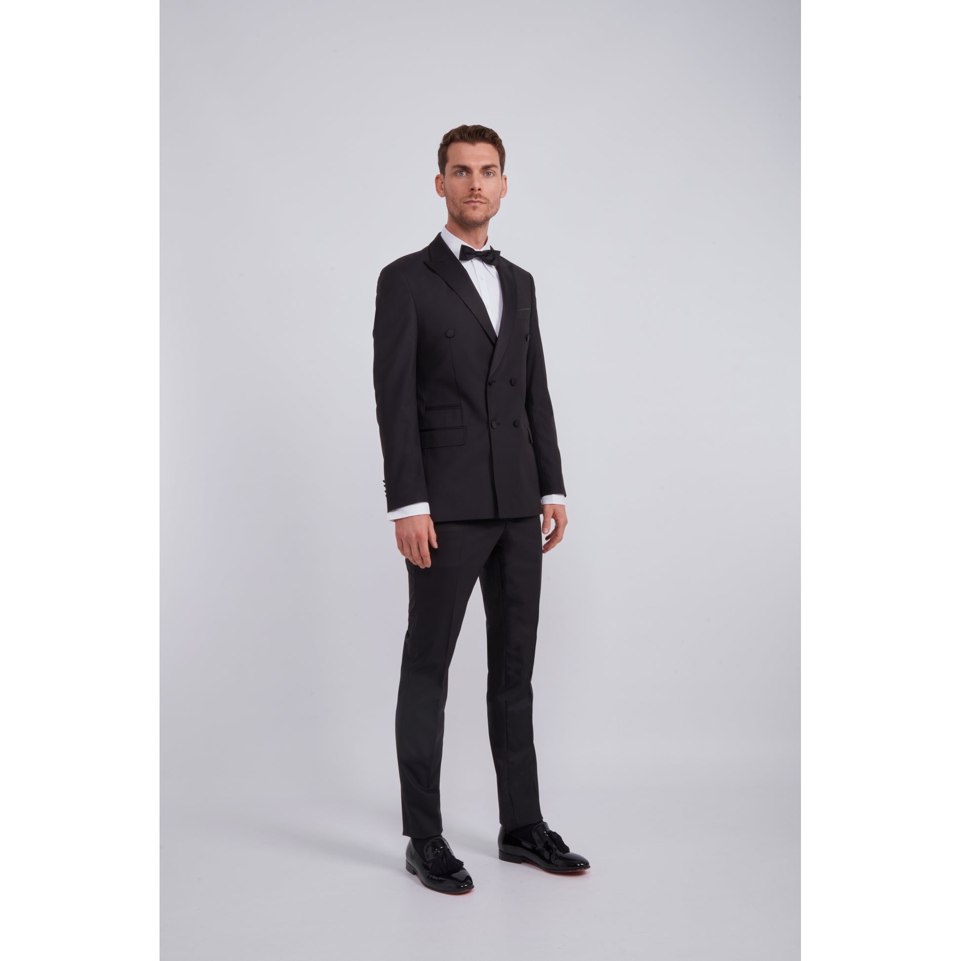 Smoking mit Satinkragen, taillierter Schnitt. Wollstoff gemischt mit Lycra, sehr angenehm zu tragen.