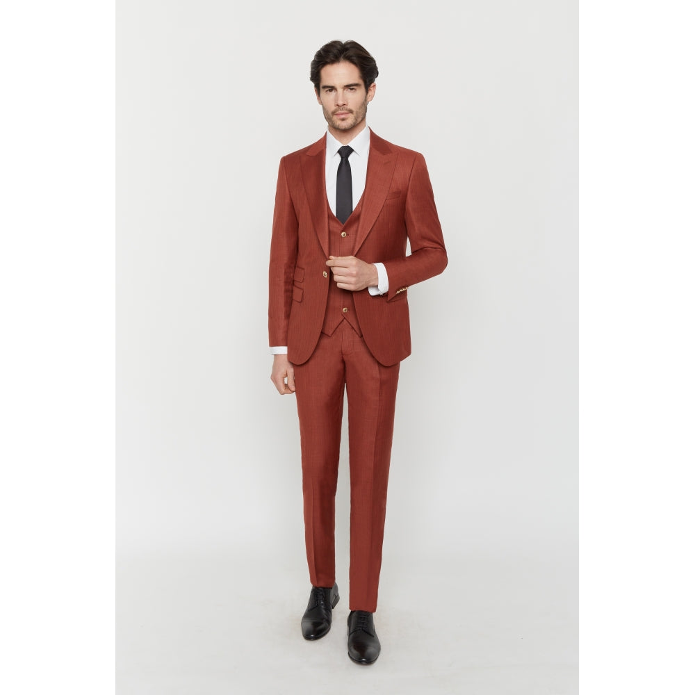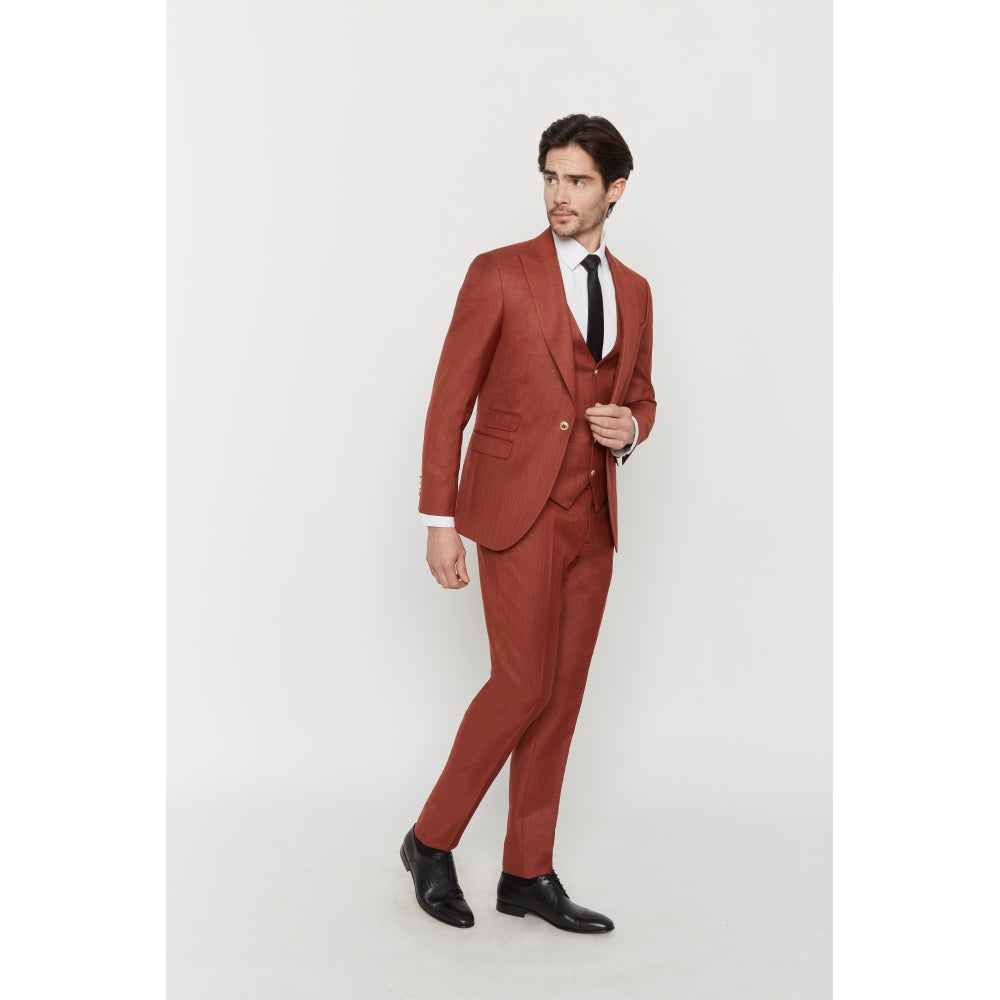 Der Shelby ist ein City-Anzug im Chiné-Look aus Fil a Fil. Die Jacke hat einen Knopf und die passende Weste. Der spitze Kragen verleiht ihr ein formelles Outfit und der Stoff enthält Lycra für extremen Komfort.