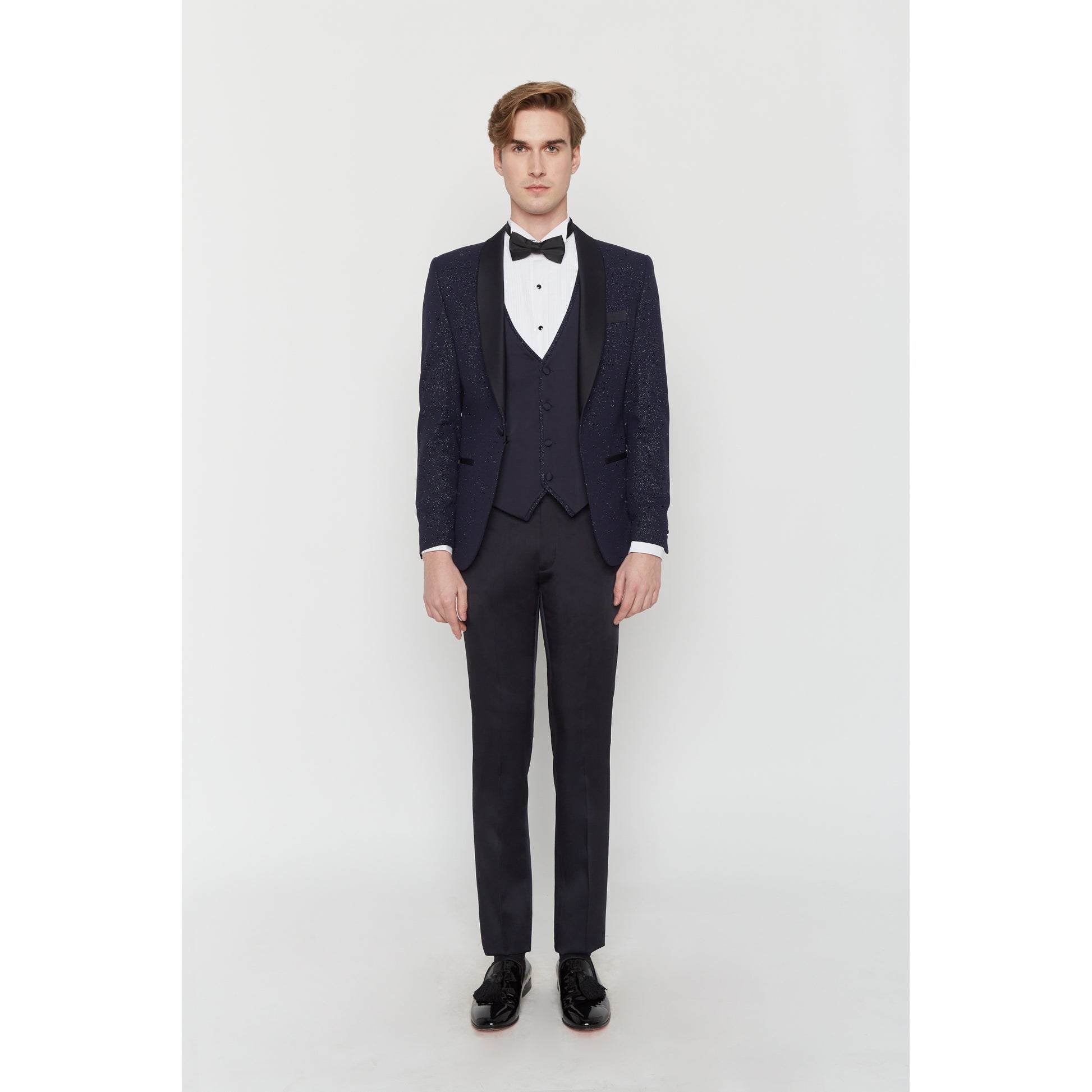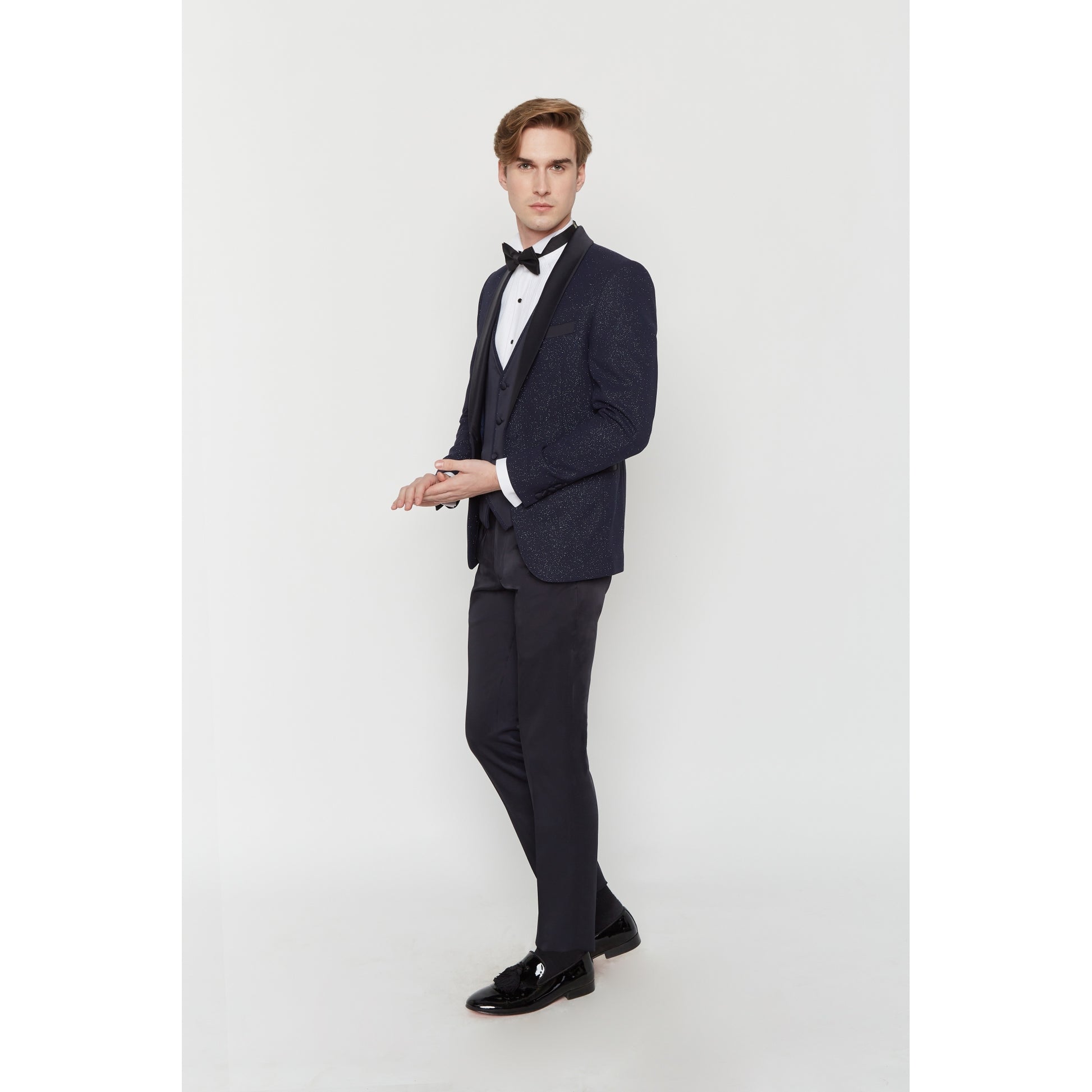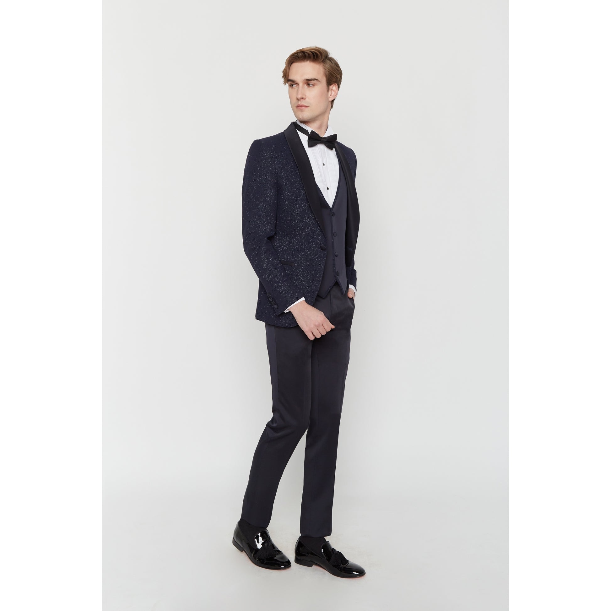 Dieser Smoking aus Wollmischung verfügt über Lycra für optimalen Komfort. Dieses körperbetonte Set besteht aus einer Satinjacke mit Schalkragen und 2 Pattentaschen und einer Satinhose mit Reißverschluss und 2 italienischen Taschen.