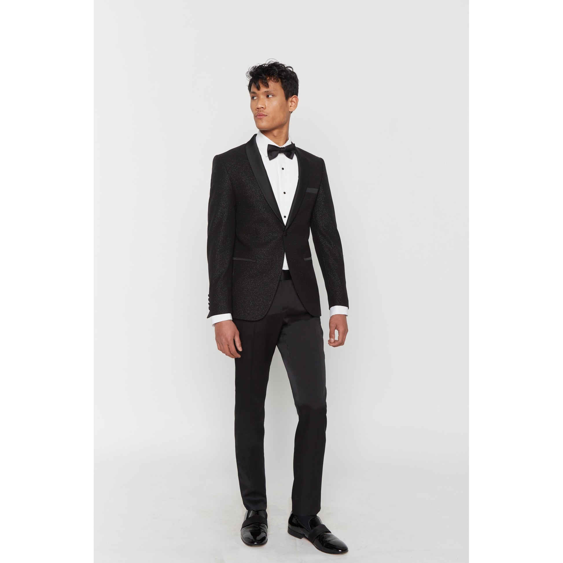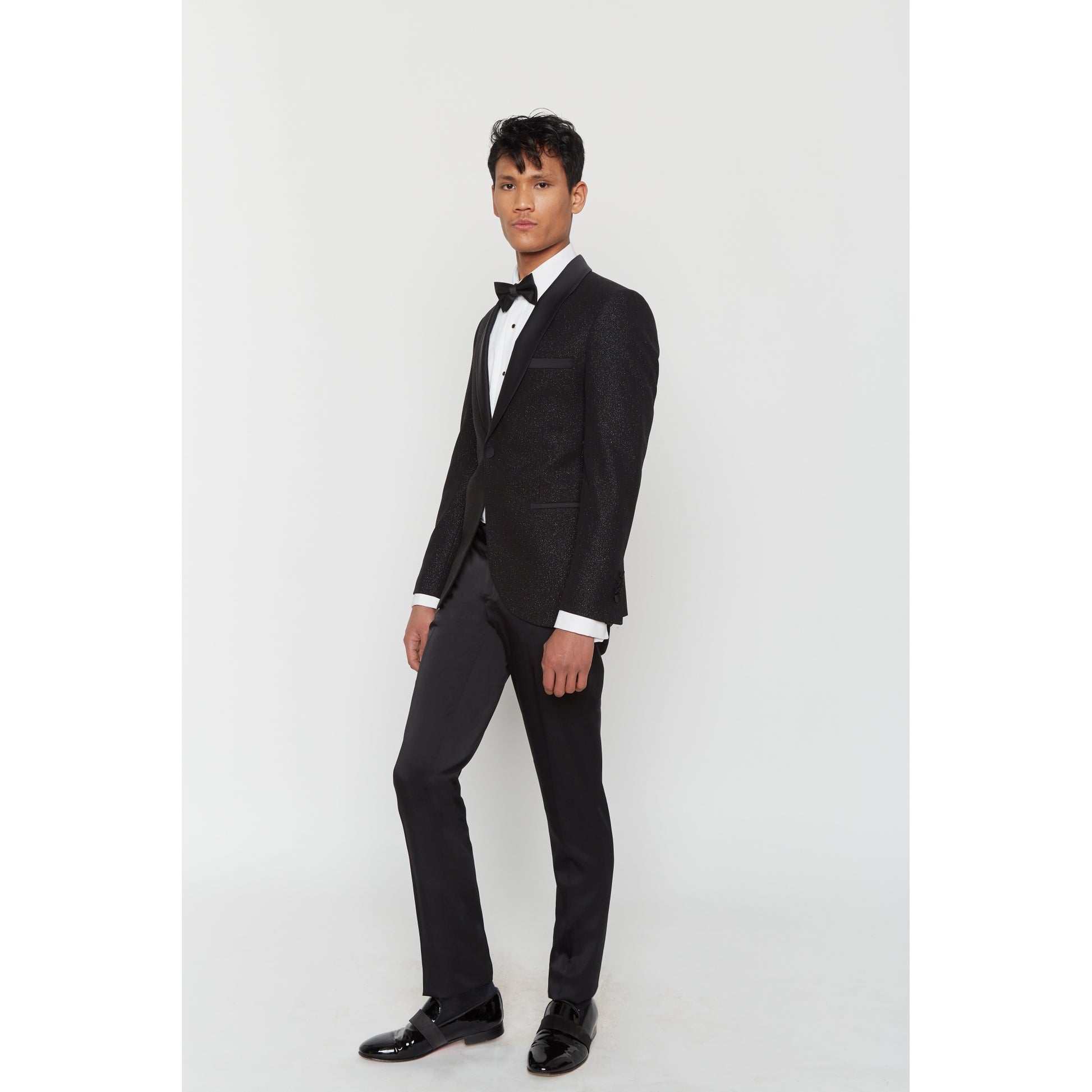 Dieser Smoking aus Wollmischung verfügt über Lycra für optimalen Komfort. Dieses körperbetonte Set besteht aus einer Satinjacke mit Schalkragen und 2 Pattentaschen und einer Satinhose mit Reißverschluss und 2 italienischen Taschen.