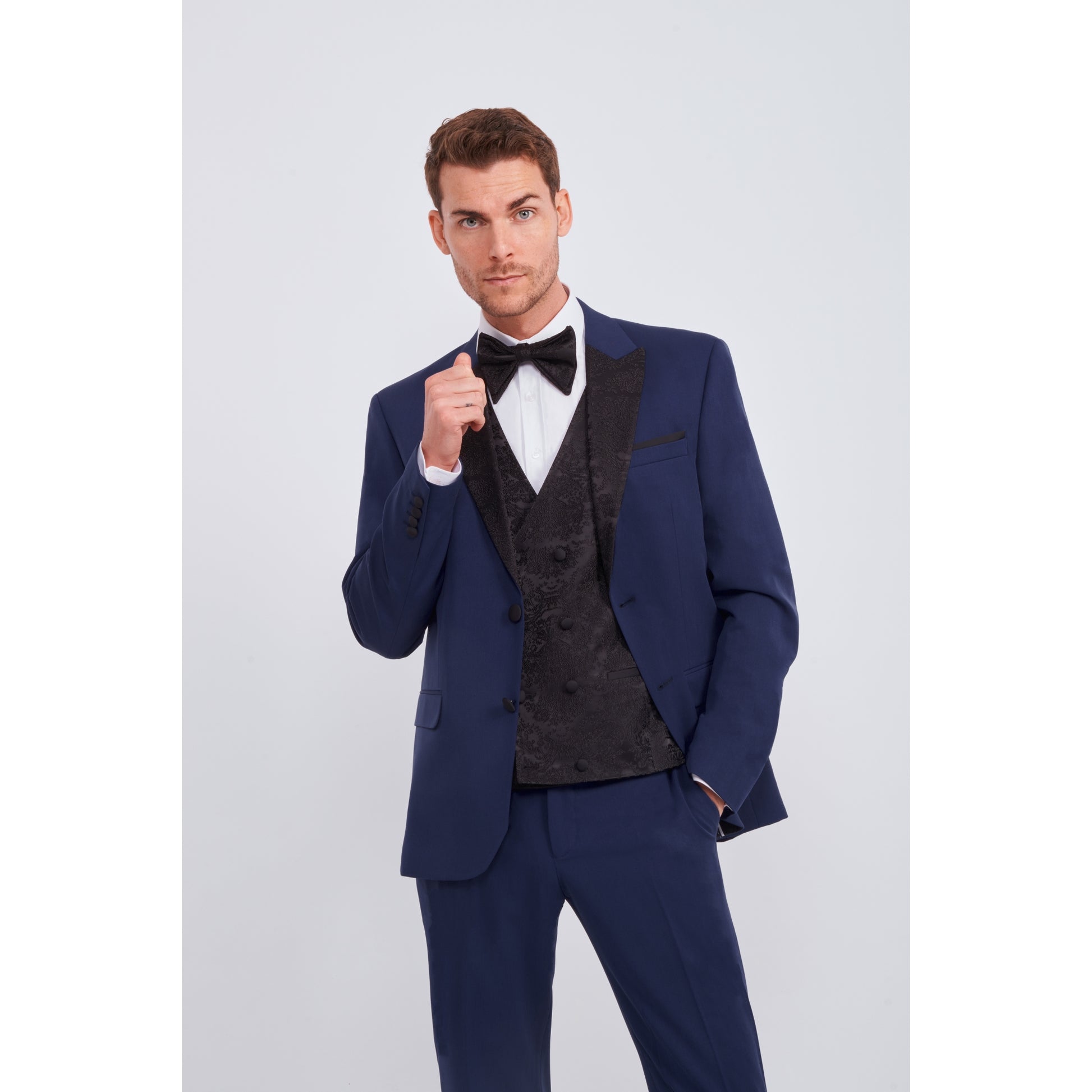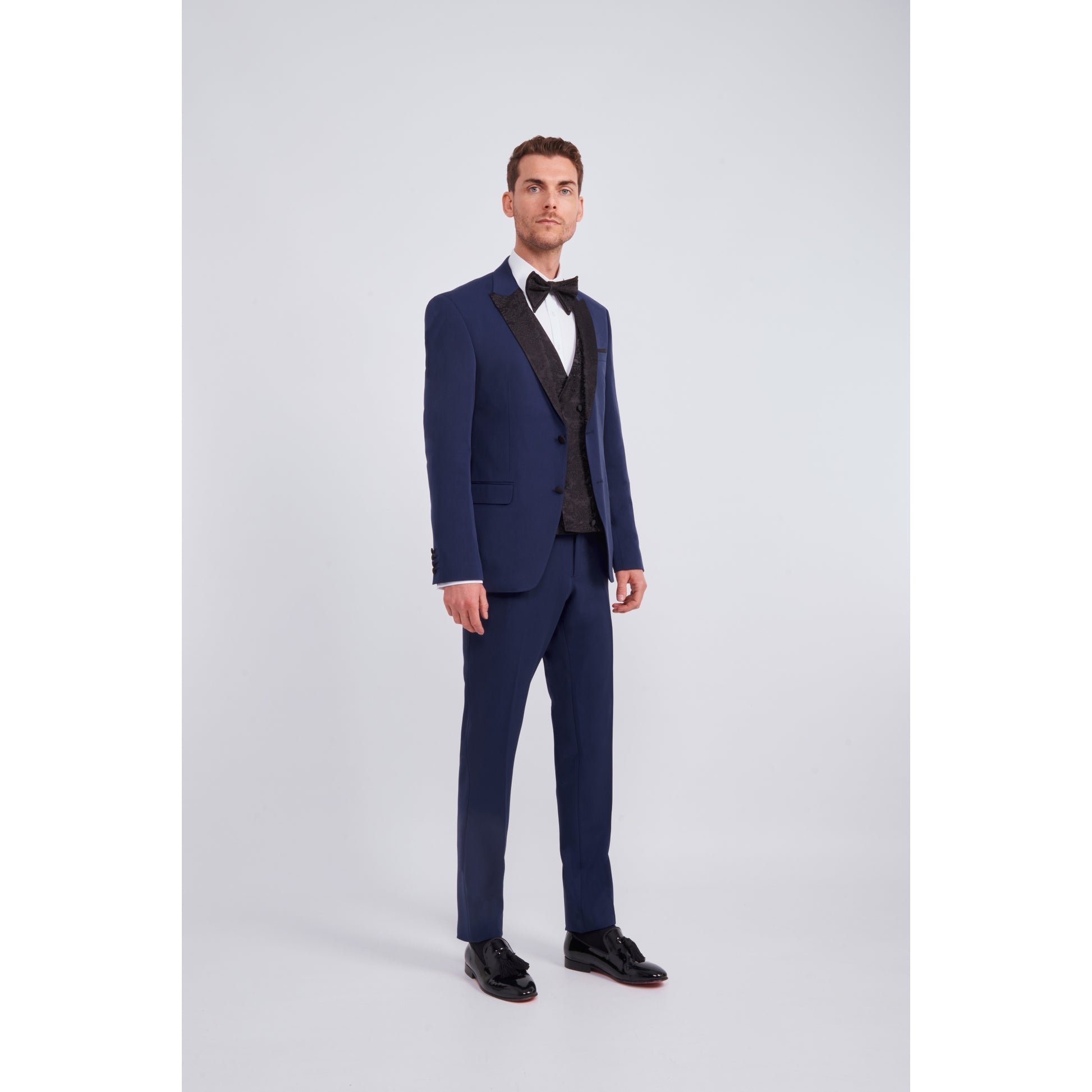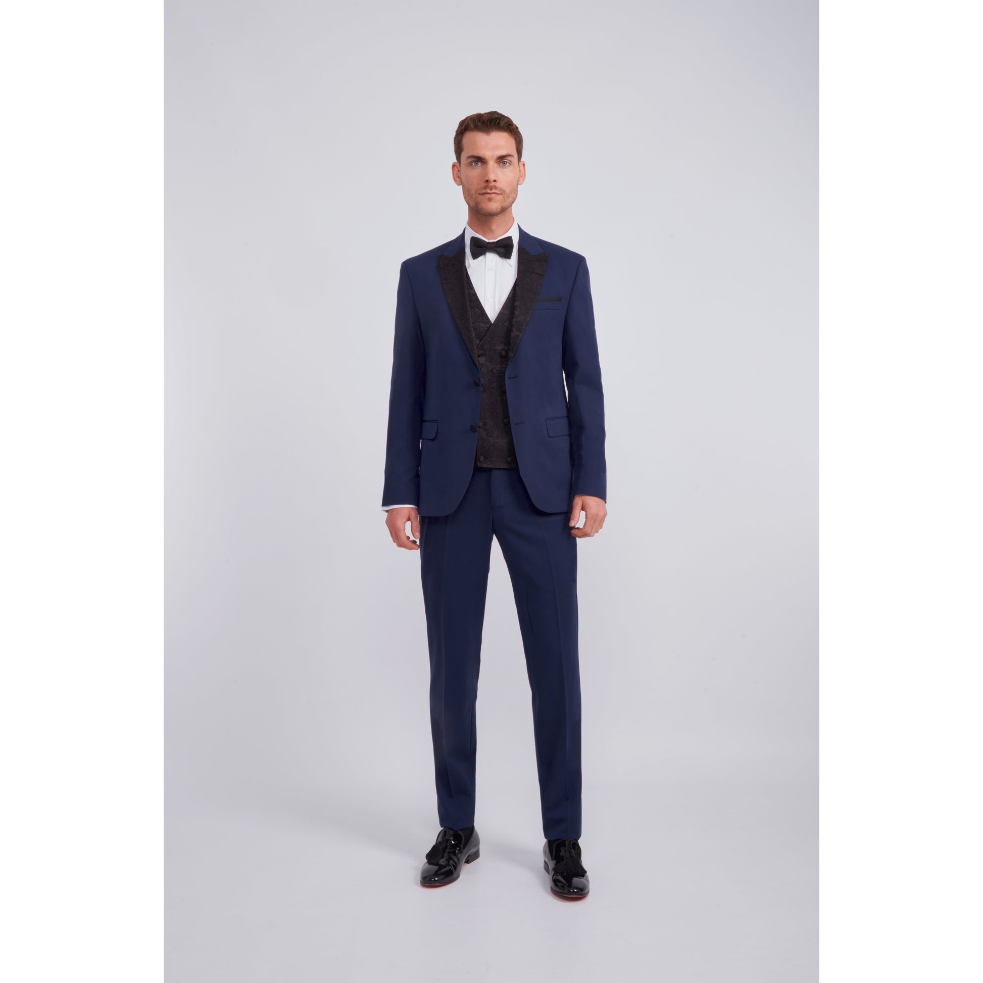 Dieser Smoking aus Wollmischung verfügt über Lycra für optimalen Komfort. Dieses körperbetonte Set besteht aus einer Jacke mit spitzem Kragen aus Satin-Jacquard und 2 Pattentaschen, einer Hose mit Reißverschluss und 2 italienischen Taschen und einer zum Kragen passenden Weste.