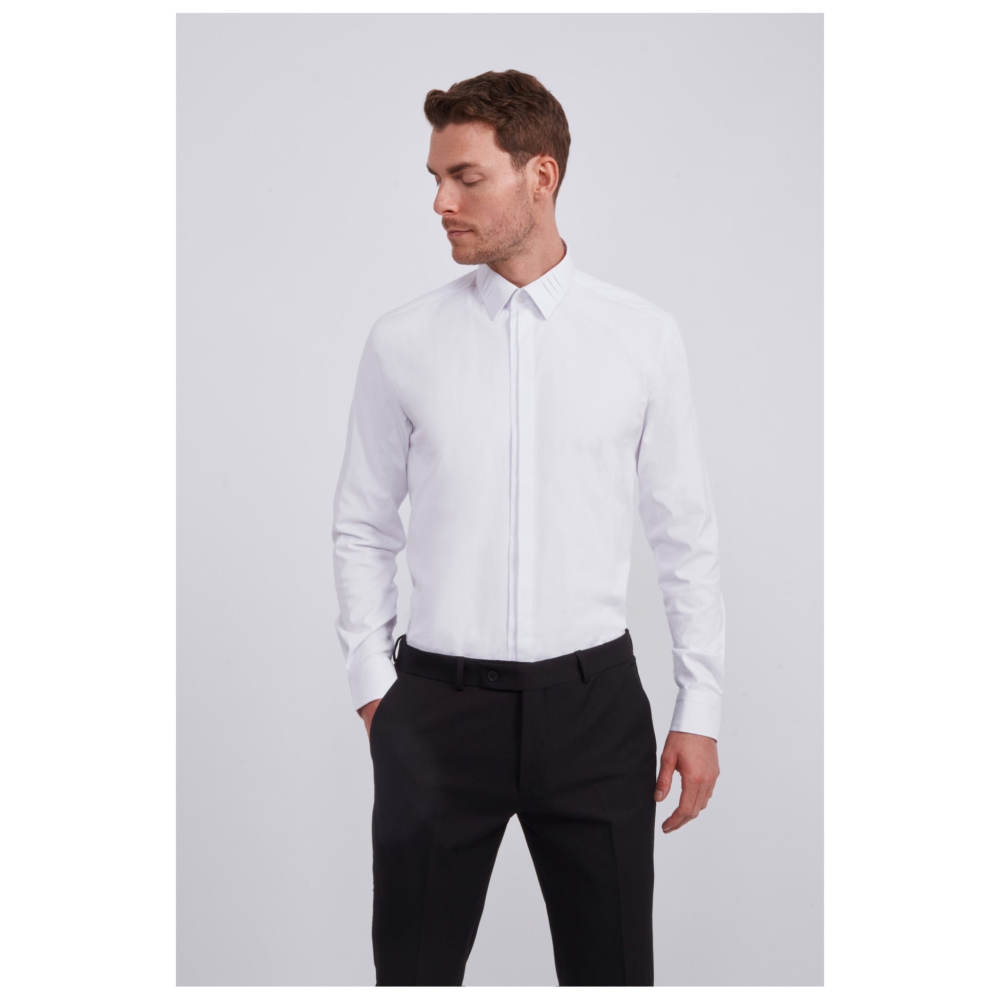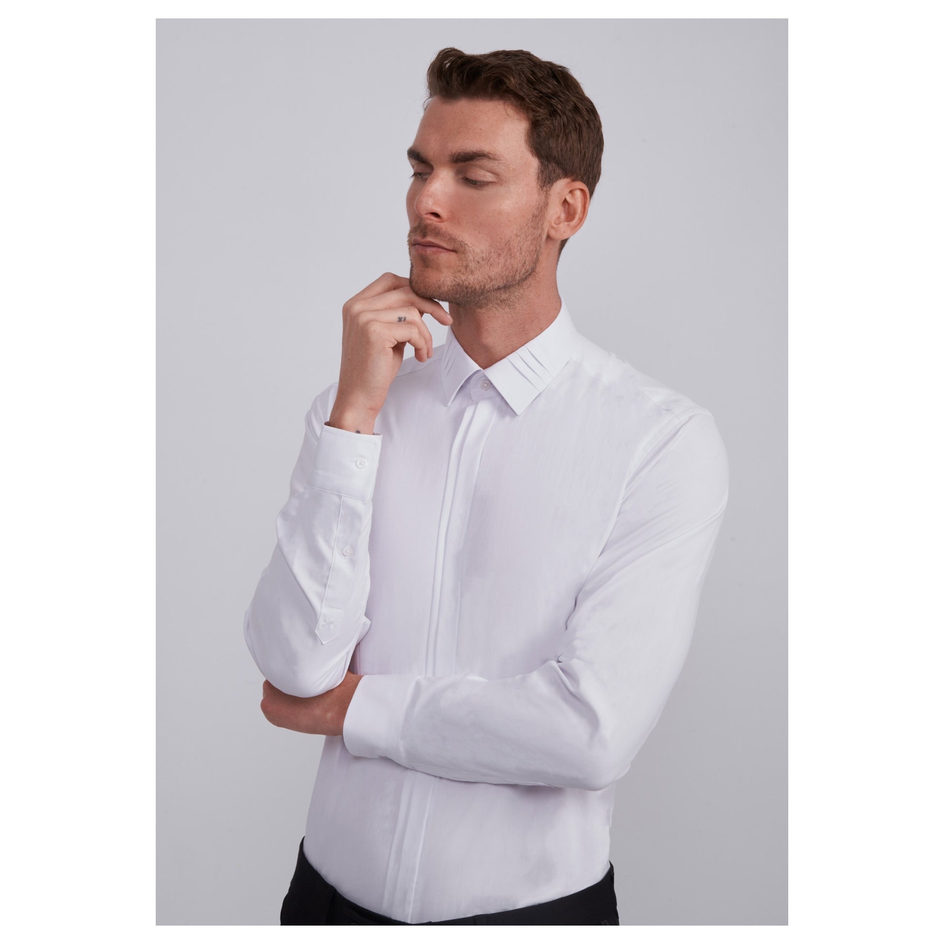 Dieses Hemd aus bügelleichtem Stoff sorgt für Komfort im Alltag. Sein plissierter französischer Kragen verleiht Ihnen einen eleganten und originellen Look. Versteckte Knopfleiste und gemischte Manschette (Manschettenknopf möglich). Ein schickes und perfekt passendes Hemd aus weichem Kaschmir. Sorgt für ein wohles Gefühl bei jedem Event.  ⦁ Passend zu jedem Anzug ⦁ Elegant und weich ⦁ Aus weichem Kaschmir