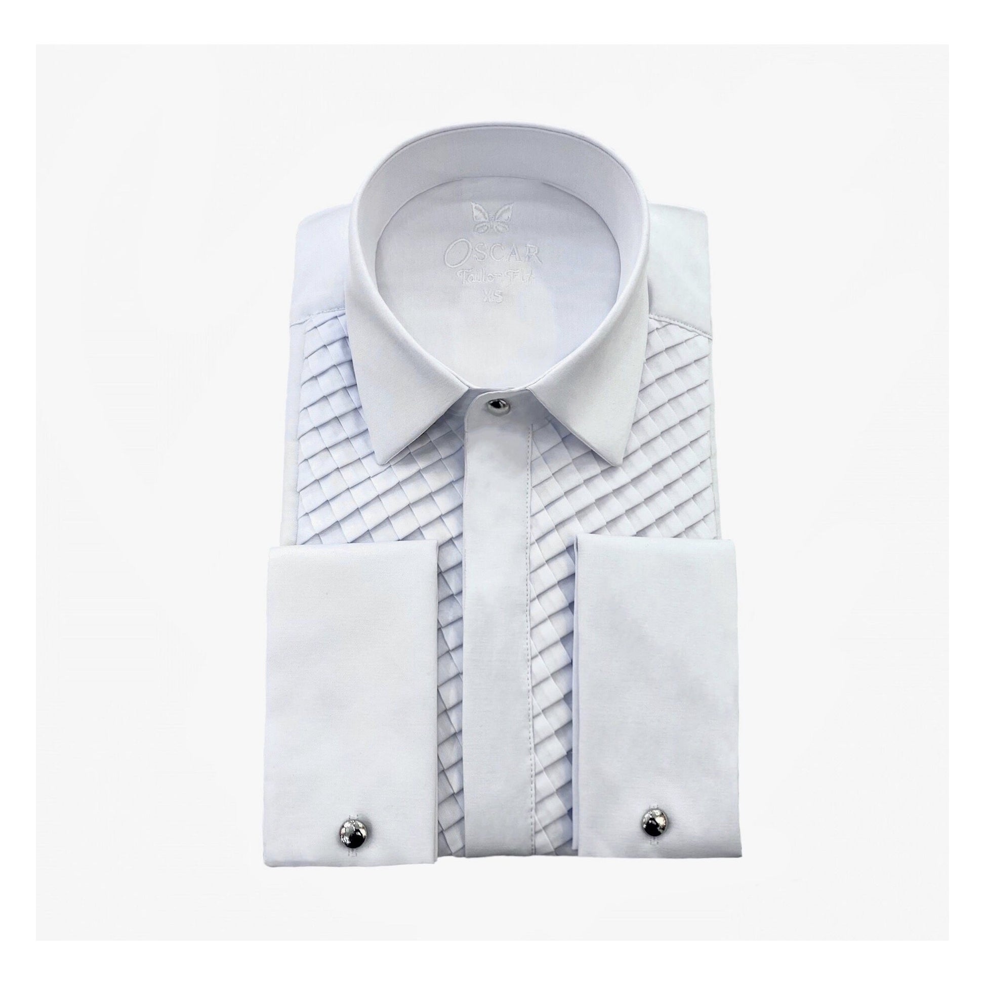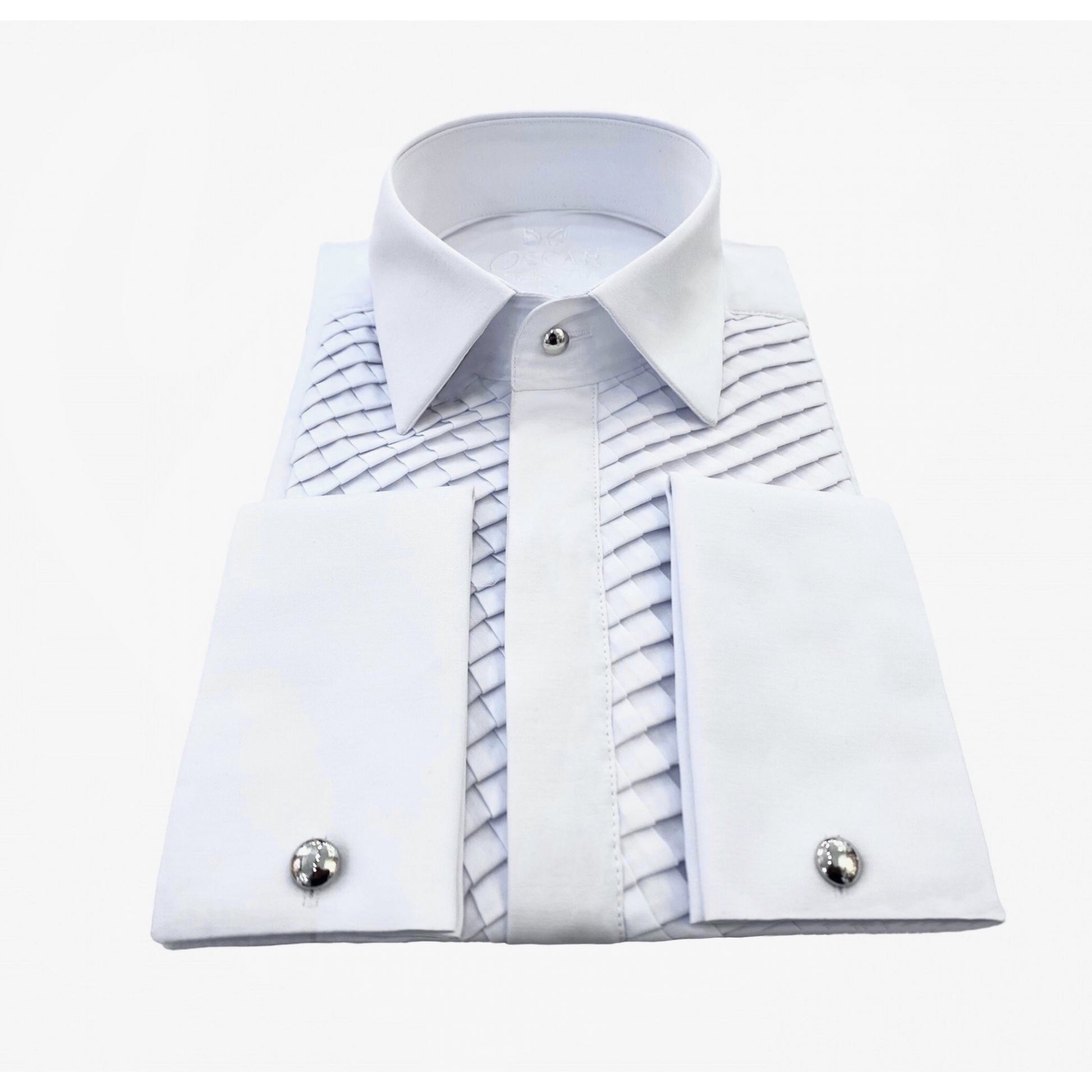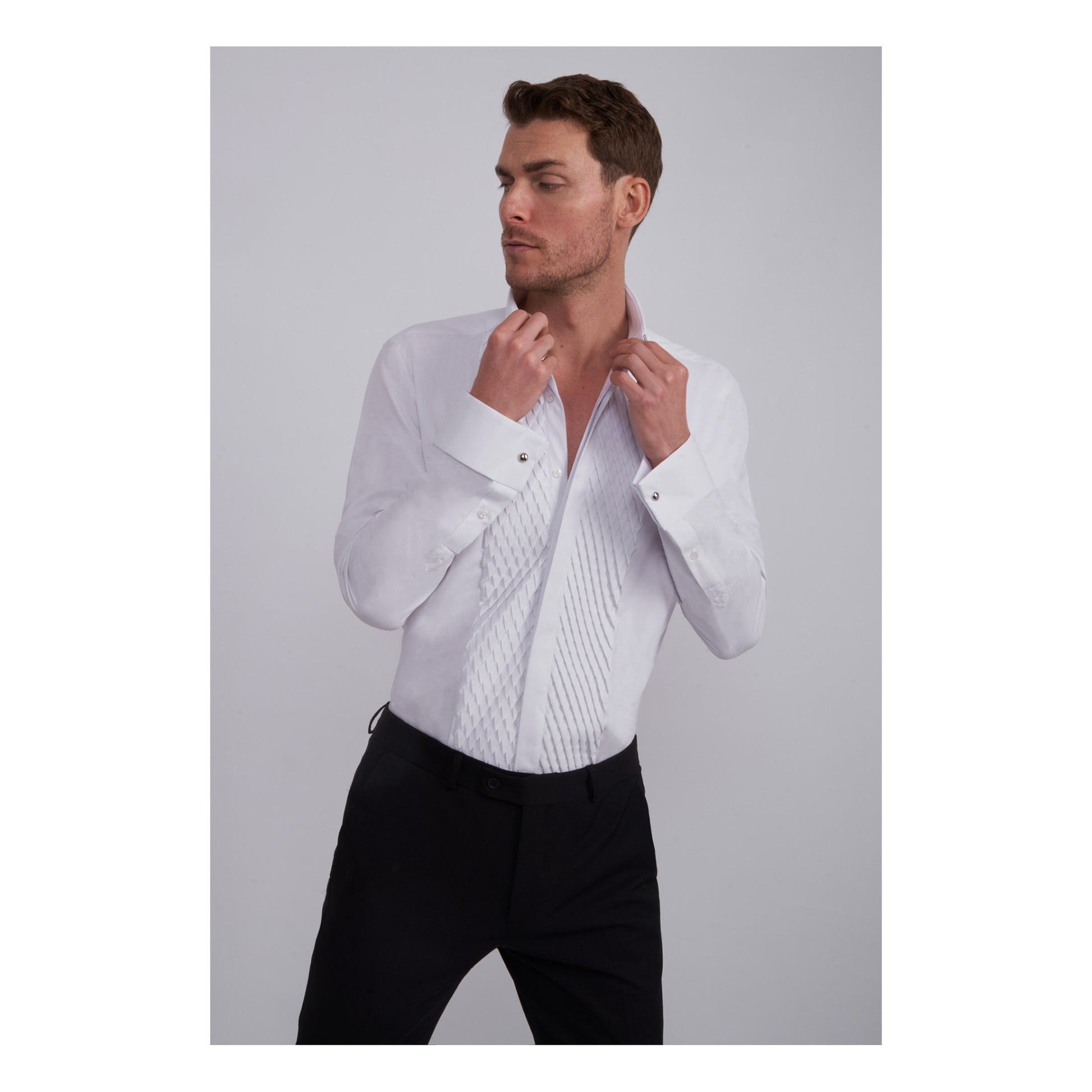 Dieses Hemd aus bügelleichtem Stoff verleiht Ihnen Eleganz und Komfort für alle Ihre besonderen Anlässe. Hemd mit französischem Kragen, plissiertem Latz und verdeckter Knopfleiste. Musketiergriff mit abnehmbarem silbernen Metallknopf. ⦁ Passend zu jedem Anzug ⦁ Elegant und weich ⦁ Aus weichem Kaschmir