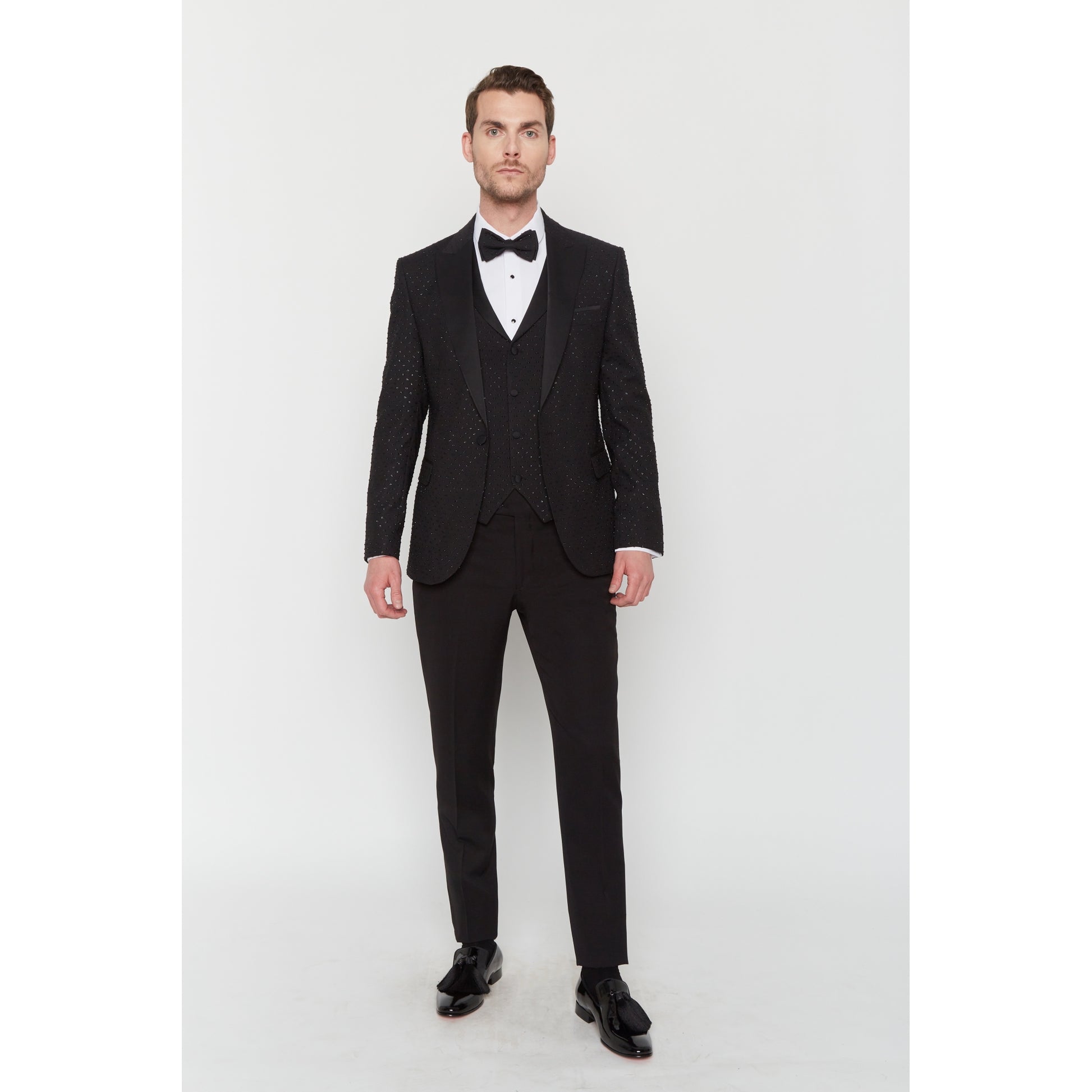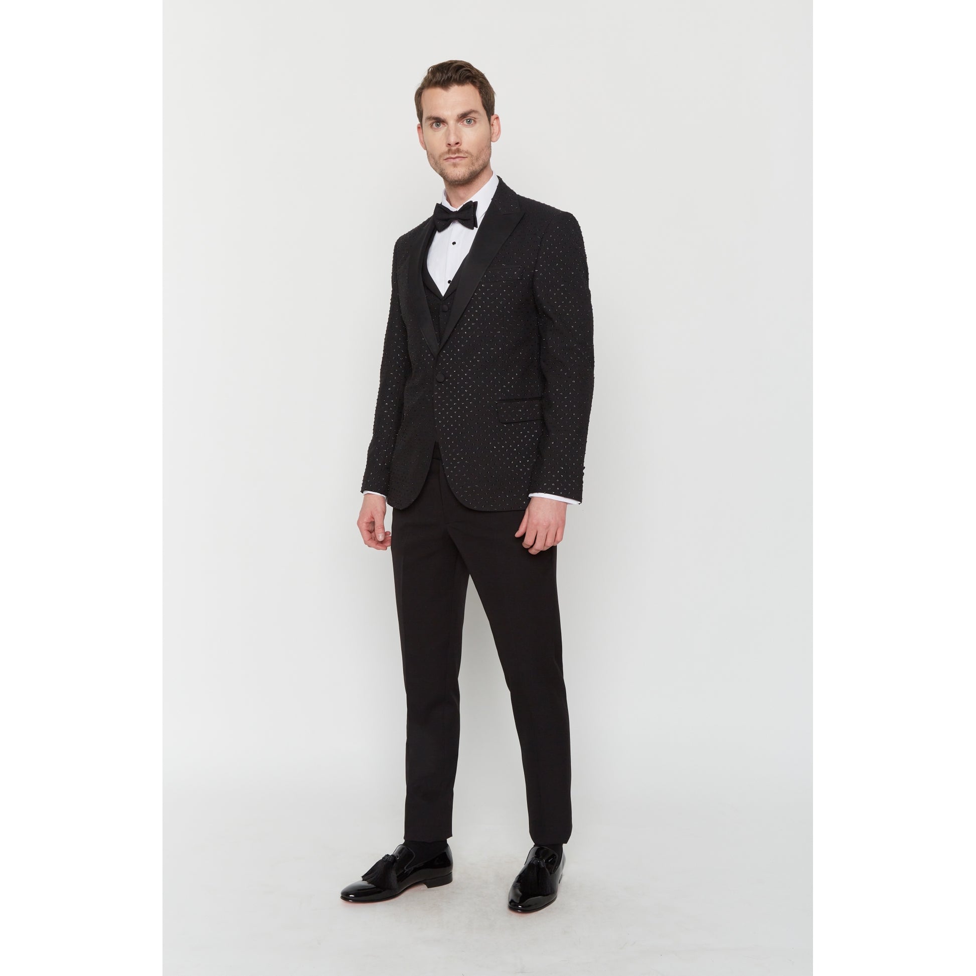 Smoking mit spitzem Kragen, schmaler Schnitt. Jacke und Weste aus Ton-in-Ton-Strassstoff, schwarze Hose.